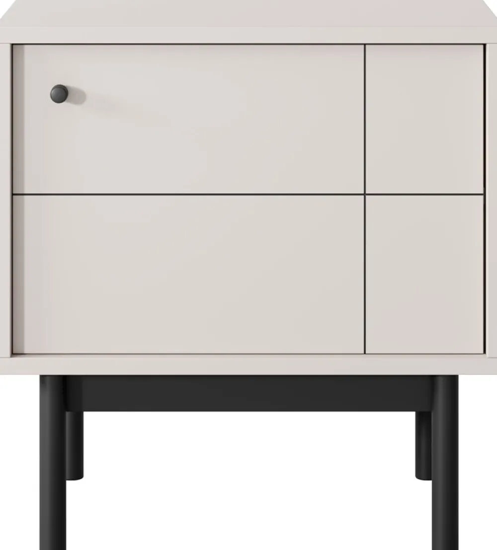 Szafka nocna stoi na wysokich drewnianych nóżkach w czarnym kolorze, które nadają jej lekkości i zapewniają stabilność. Nóżki ułatwiają również sprzątanie pod meblem, co jest szczególnie praktyczne w codziennym użytkowaniu. Dzięki przemyślanej konstrukcji i starannemu wykończeniu ta szafka nocna doskonale uzupełni każdą sypialnię, wprowadzając do niej harmonię i funkcjonalność.