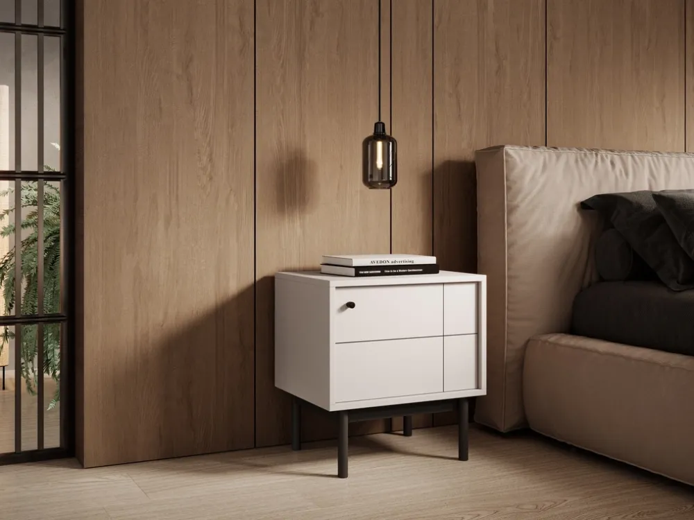 Elegancka szafka nocna o wysokości 54 cm JUVA to idealny dodatek do każdej sypialni, łączący w sobie funkcjonalność i nowoczesny styl. Została zaprojektowana z myślą o osobach, które cenią wygodę i estetykę, wprowadzając do wnętrza przytulny i wyrafinowany charakter.