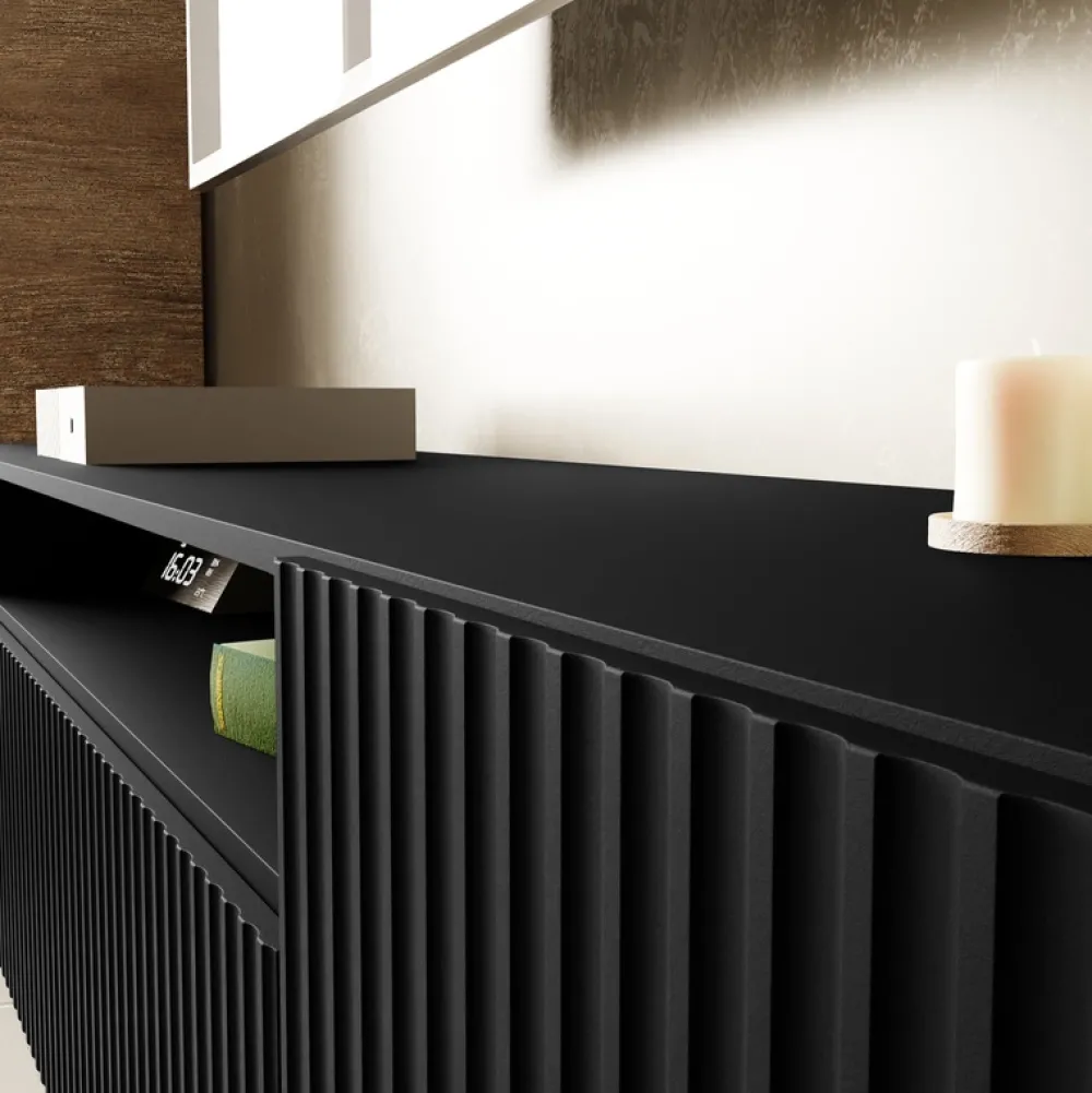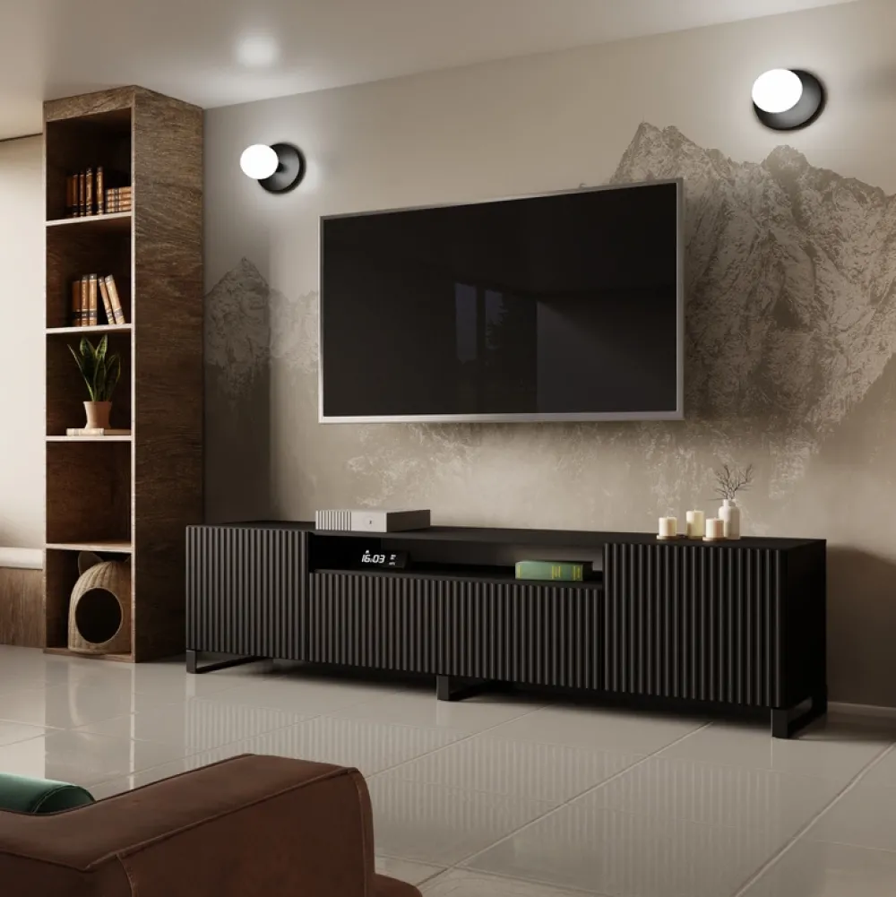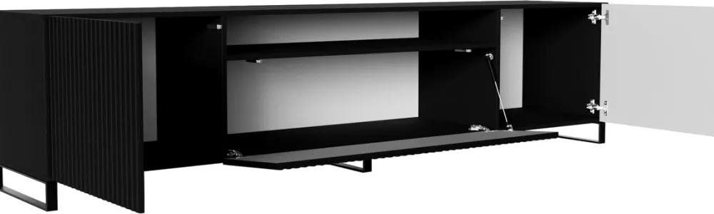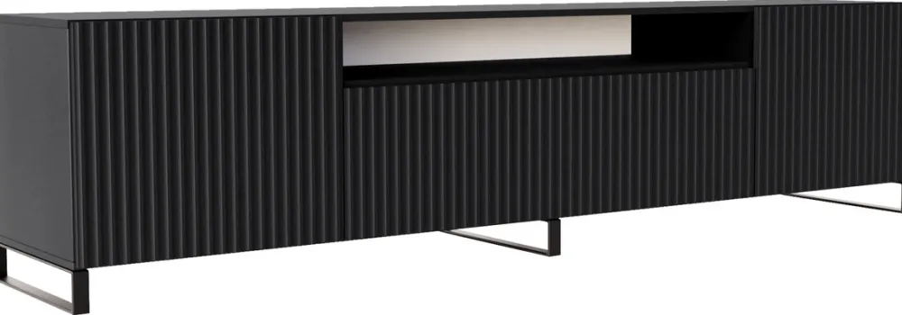 Szafka RTV TAVIO to połączenie eleganckiego designu i praktycznych rozwiązań, które sprawią, że Twój salon nabierze wyjątkowego charakteru. Szerokość 200 cm zapewnia dużo miejsca na sprzęt multimedialny, a frezowane fronty z płyty MDF dodają meblowi nowoczesnego wyglądu. Wysokie, czarne metalowe nóżki nadają lekkości, jednocześnie ułatwiając utrzymanie porządku pod meblem.