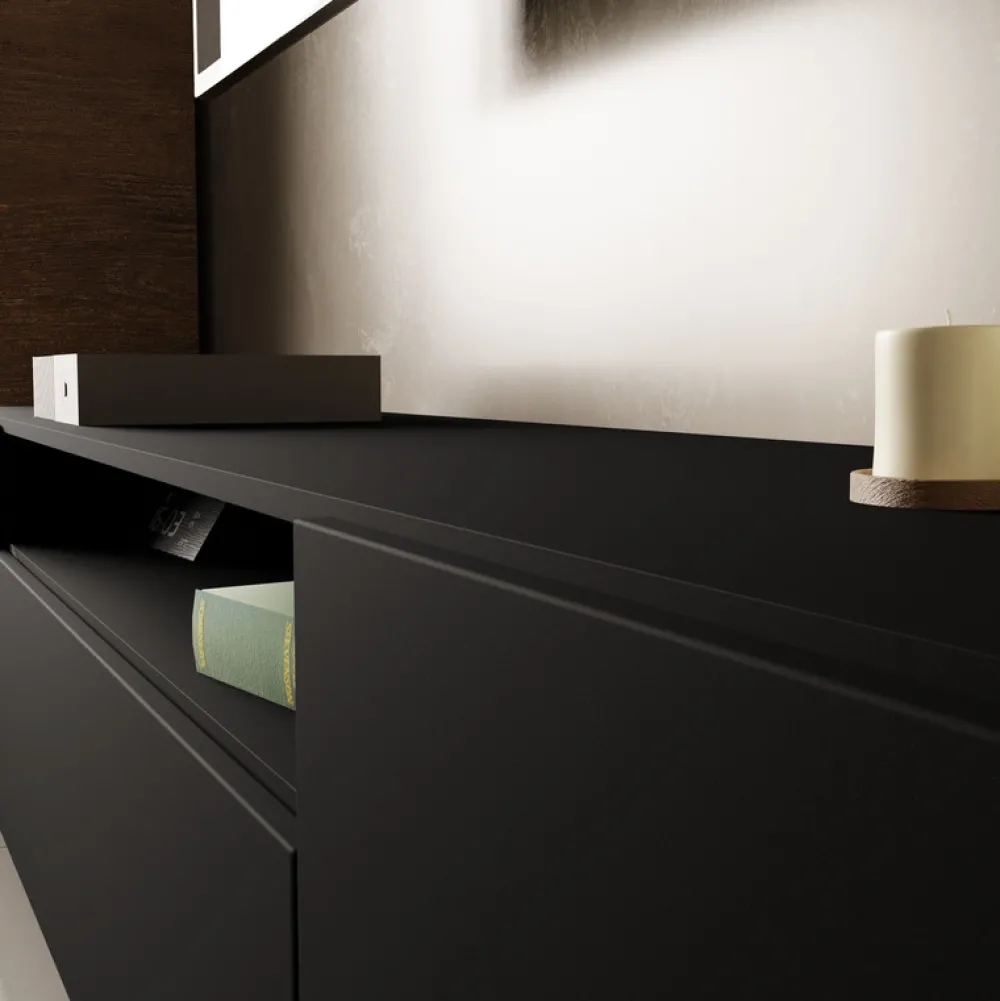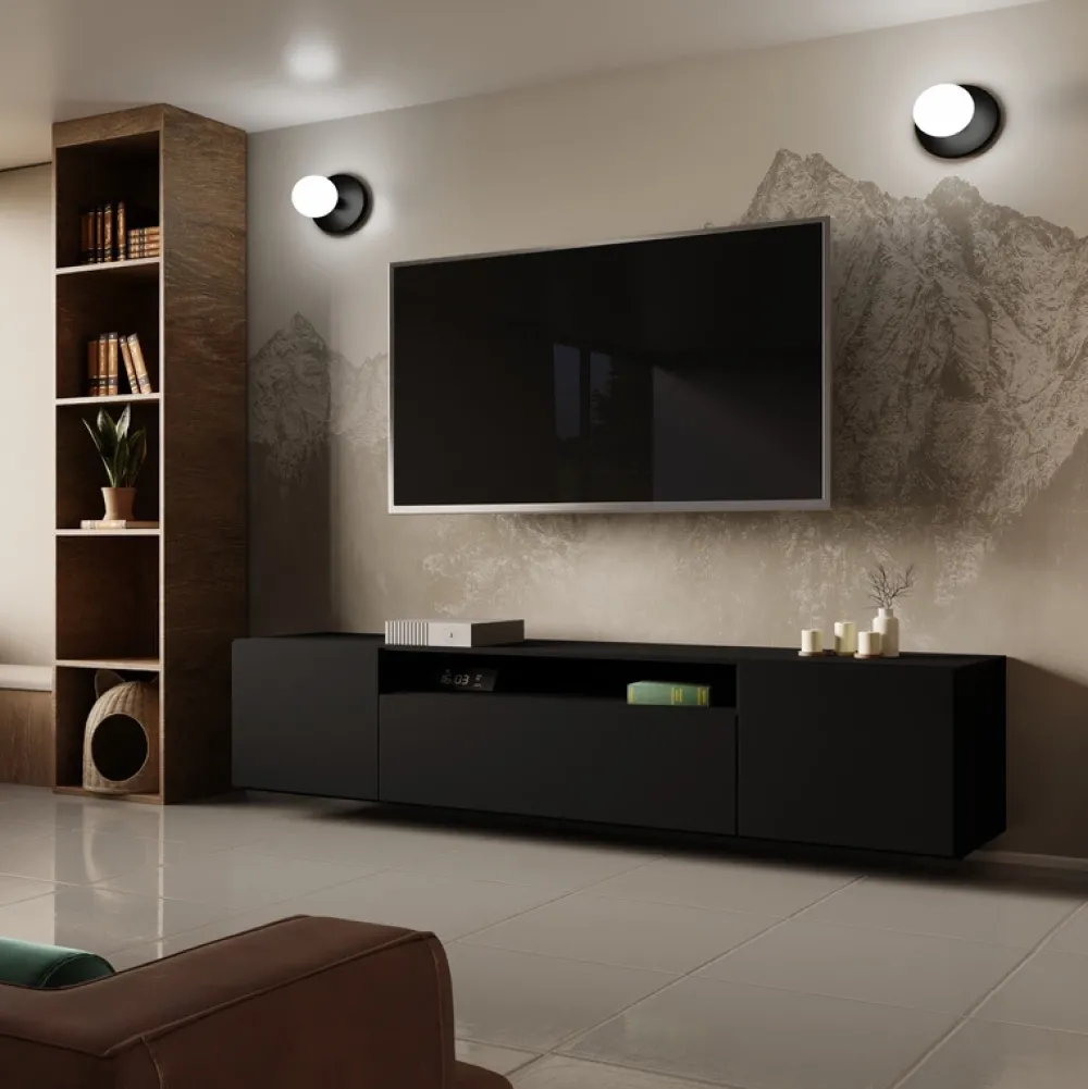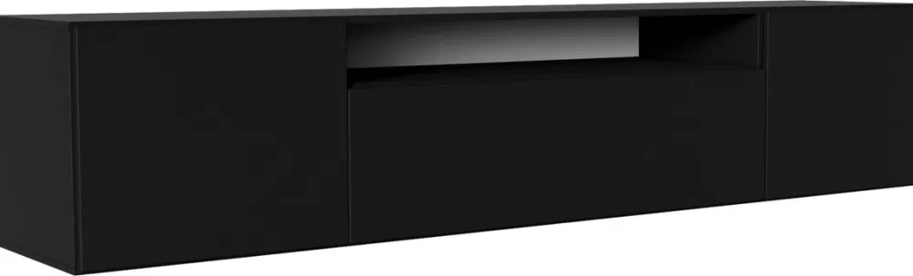 - Czarna szafka RTV o szerokości 200 cm LANTOS poza wyjątkowym wyglądem wyposażona została w praktyczną wnękę pośrodku, dwie zamykane szafki po bokach, a także uchylne drzwi pod wnęką. Szafka RTV jest wisząca i wykonana została z płyty meblowej.