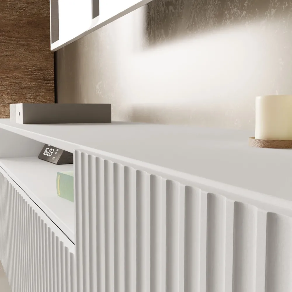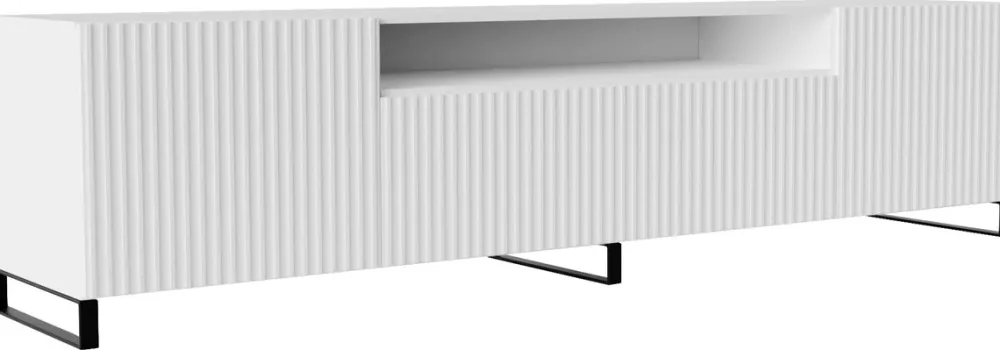 - Stojąca szafka RTV o szerokości 200 cm wyposażona we frezowane fronty wykonane z białej płyty MDF. Pośrodku znajduje się wnęka na sprzęt multimedialny, pod nią uchylny front, a po bokach znalazły miejsce dwie zamykane szafki. Nóżki wykonane z metalu.