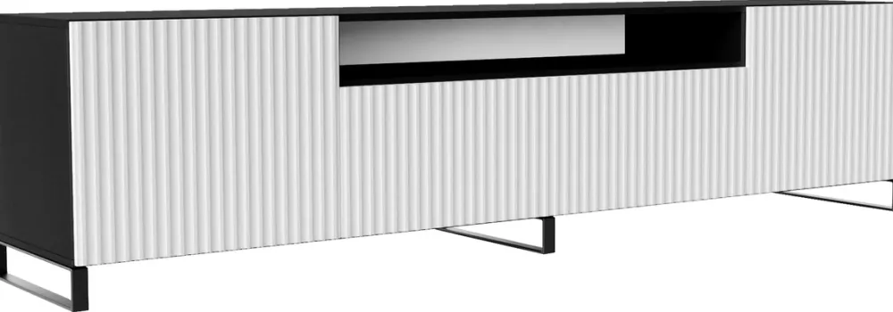 Szafka RTV TAVIO to połączenie eleganckiego designu i praktycznych rozwiązań, które sprawią, że Twój salon nabierze wyjątkowego charakteru. Szerokość 200 cm zapewnia dużo miejsca na sprzęt multimedialny, a frezowane fronty z płyty MDF dodają meblowi nowoczesnego wyglądu. Wysokie, czarne metalowe nóżki nadają lekkości, jednocześnie ułatwiając utrzymanie porządku pod meblem.