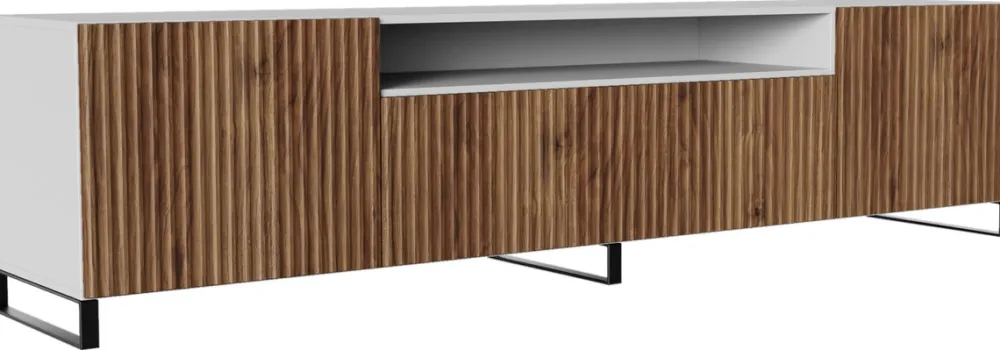 - Stojąca szafka RTV o szerokości 200 cm wyposażona we frezowane fronty wykonane z białej płyty MDF. Pośrodku znajduje się wnęka na sprzęt multimedialny, pod nią uchylny front, a po bokach znalazły miejsce dwie zamykane szafki. Nóżki wykonane z metalu.