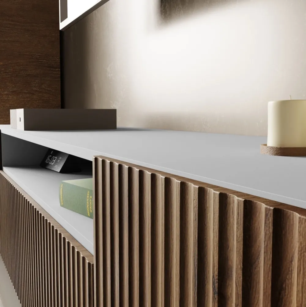 ✅ Uchylny front pod wnęką – dodatkowa przestrzeń na akcesoria RTV.