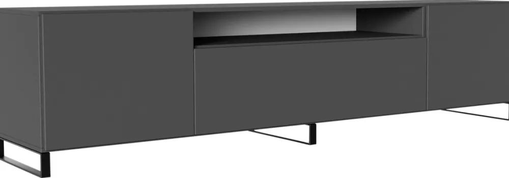 Dzięki szerokości 200 cm szafka oferuje mnóstwo miejsca na sprzęt RTV oraz inne akcesoria. Środkowa wnęka to idealne rozwiązanie dla dekoderów czy konsol, a boczne szafki pomieszczą dokumenty, płyty lub inne drobiazgi. Dodatkowo uchylne drzwi w dolnej części zapewniają łatwy dostęp do przechowywanych przedmiotów.