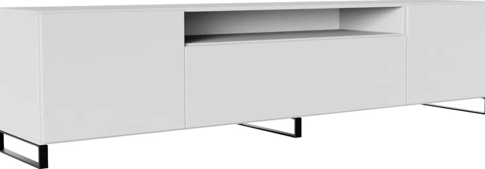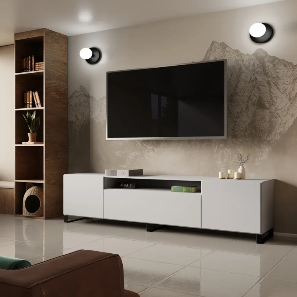 Dzięki szerokości 200 cm szafka oferuje mnóstwo miejsca na sprzęt RTV oraz inne akcesoria. Środkowa wnęka to idealne rozwiązanie dla dekoderów czy konsol, a boczne szafki pomieszczą dokumenty, płyty lub inne drobiazgi. Dodatkowo uchylne drzwi w dolnej części zapewniają łatwy dostęp do przechowywanych przedmiotów.