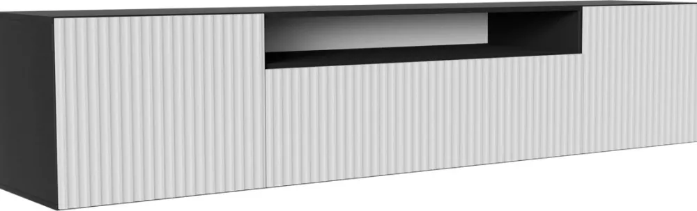- Wisząca szafka RTV TAVIO o szerokości 200 cm. Wyposażona została w frezowane fronty wykonane z płyty MDF w kolorze białym. Szafka RTV posiada wnękę na sprzęt multimedialny i dekoracje, uchylny front pośrodku oraz dwie zamykane szafki po bokach.