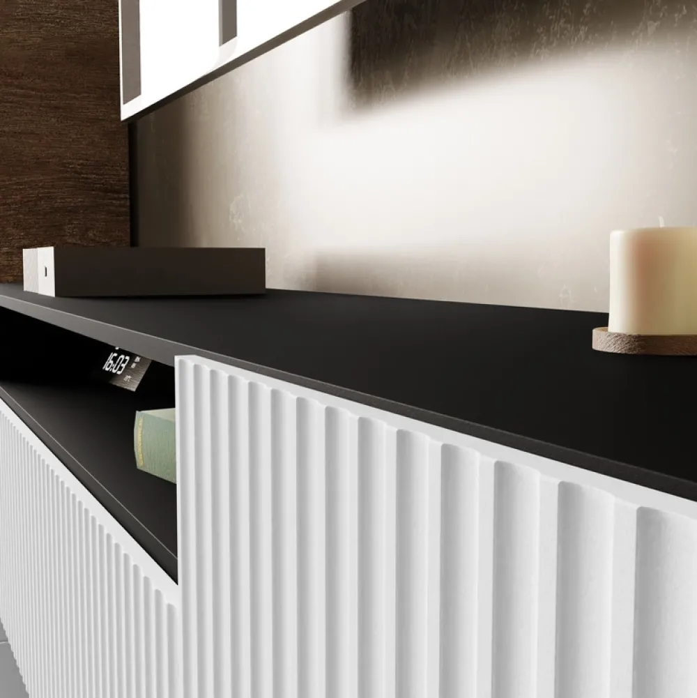 Szafka RTV TAVIO to połączenie elegancji i praktyczności, które podkreśli nowoczesny charakter Twojego wnętrza. Dzięki szerokości 200 cm doskonale sprawdzi się w przestronnych salonach, zapewniając nie tylko miejsce na sprzęt multimedialny, ale także dodatkową przestrzeń do przechowywania. Charakterystyczne frezowane fronty z płyty MDF nadają meblowi unikalny wygląd, który wpisuje się w aktualne trendy wnętrzarskie.