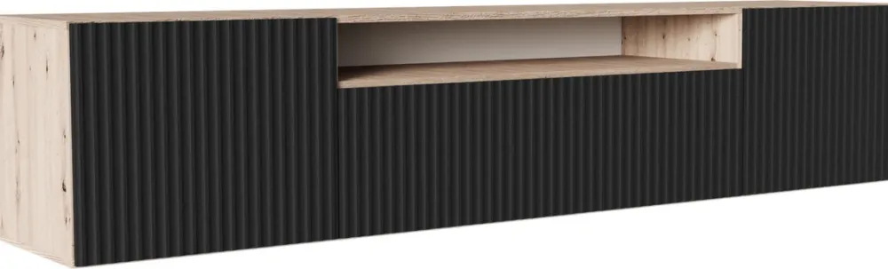 - Wisząca szafka RTV TAVIO o szerokości 200 cm. Wyposażona została we frezowane fronty wykonane z płyty MDF w kolorze czarnym. Szafka RTV posiada wnękę na sprzęt multimedialny i dekoracje, uchylny front pośrodku oraz dwie zamykane szafki po bokach.