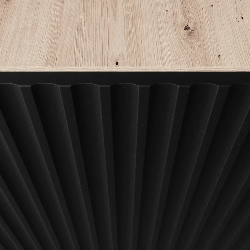 CSzafka RTV TAVIO to połączenie elegancji i praktyczności, które podkreśli nowoczesny charakter Twojego wnętrza. Dzięki szerokości 200 cm doskonale sprawdzi się w przestronnych salonach, zapewniając nie tylko miejsce na sprzęt multimedialny, ale także dodatkową przestrzeń do przechowywania. Charakterystyczne frezowane fronty z płyty MDF nadają meblowi unikalny wygląd, który wpisuje się w aktualne trendy wnętrzarskie.