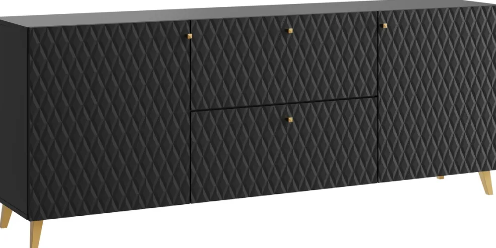 Czarny kolor w połączeniu ze złotymi nóżkami i uchwytami nadaje szafce wyjątkowej klasy. Frezowane fronty w modny wzór jodełki podkreślają jej ekskluzywny charakter, tworząc efekt głębi i dynamiki.