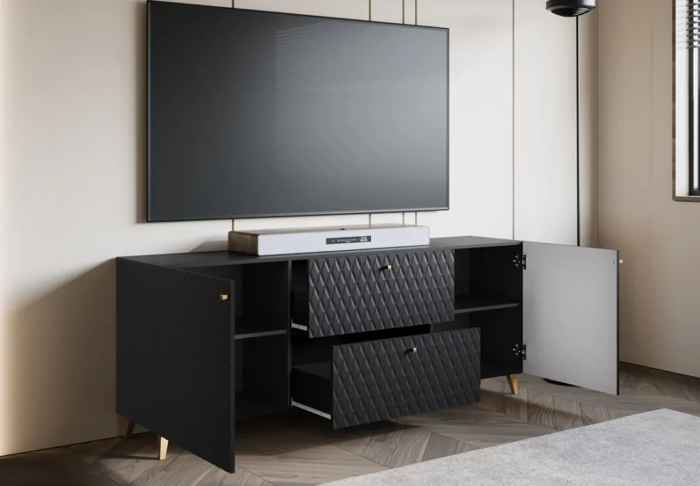 ✅ Funkcjonalna przestrzeń – dwie pojemne szuflady oraz schowki za drzwiami pomieszczą sprzęt multimedialny i akcesoria.