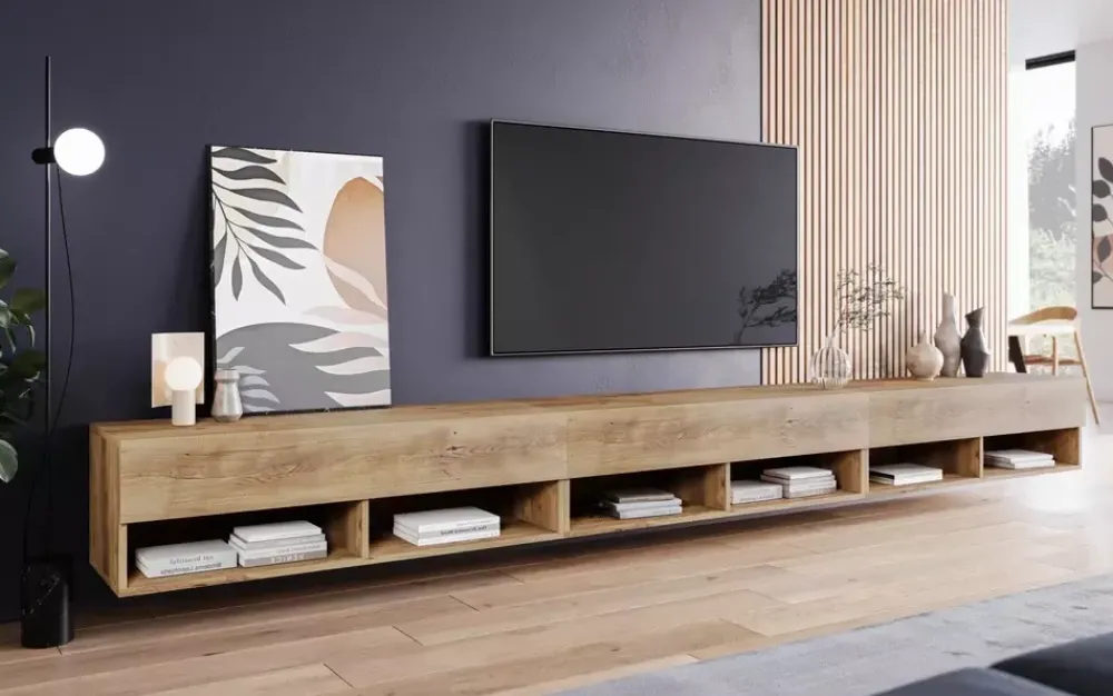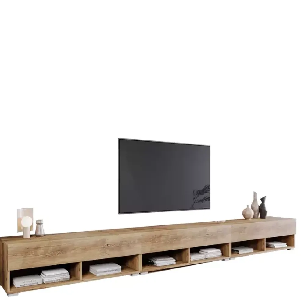 - Szafka RTV, którą postawisz na podłodze, lub powiesisz na ścianie! Wykonana z wysokiej jakości materiałów. Korpus i front w kolorze Kastanien Breslaw. Szerokość całkowita aż 300 cm, we wnętrzu trzy bezuchwytowe szafki, a także, aż 6 mniejszych wnęk.