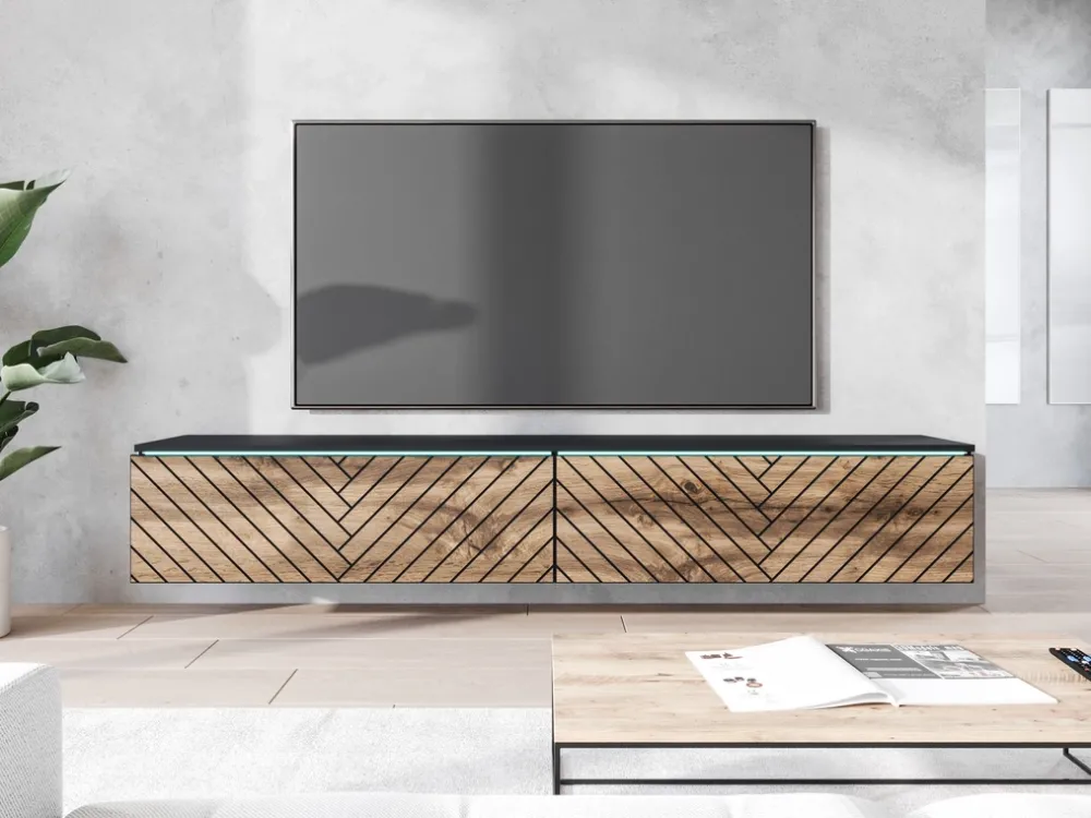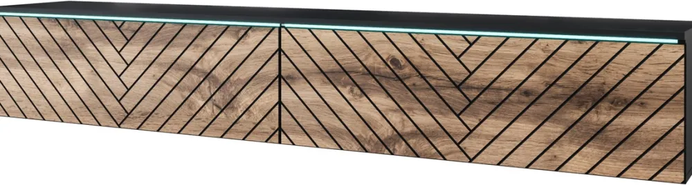 Podwieszana szafka RTV BROMI o szerokości 180 cm to wyjątkowy mebel, który nada Twojemu salonowi nowoczesny i elegancki wygląd. Jej fronty w kolorze dąb wotan dodają meblowi naturalnego i przyjemnego dla oka wyglądu, który z pewnością będzie się wyróżniał w Twoim wnętrzu.