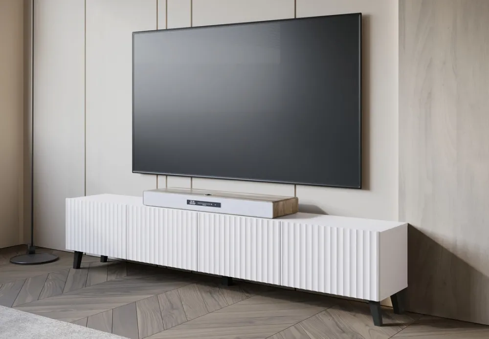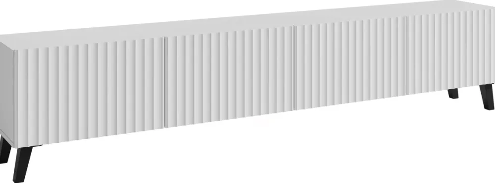 Nowoczesna szafka RTV PUNES o szerokości 190 cm w kolorze białym z ryflowanymi frontami charakteryzuje się nowoczesnym i eleganckim wyglądem, który z pewnością wpasuje się w różne wnętrza. Korpus szafki wykonany został z płyty laminowanej o grubości 15 mm, natomiast ryflowane fronty, które dodają meblowi wyjątkowego charakteru, wykonane zostały z wysokiej jakości płyty MDF o grubości 18 mm i dodatkowo zabezpieczone wodoodporną folią, chroniącą przed wilgocią. Zapewnia to meblowi wytrzymałość i stabilność, jednocześnie gwarantując, że codzienne użytkowanie nie będzie dla szafki wyzwaniem.