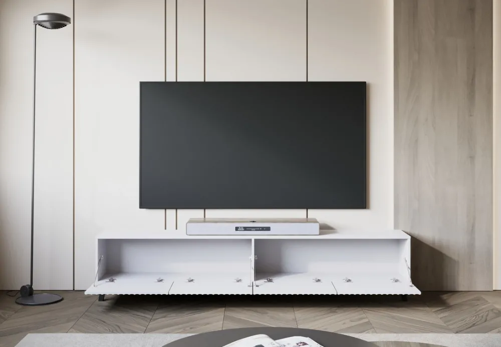 Biała szafka RTV pod telewizor PUNES wyposażona jest w mechanizm cichego domyku, co minimalizuje trzaski i hałasy przy zamykaniu drzwi, zwiększając komfort użytkowania. Drzwi otwierają się przez chwycenie za wystającą krawędź frontu, co jest praktycznym rozwiązaniem zapewniającym łatwość obsługi.