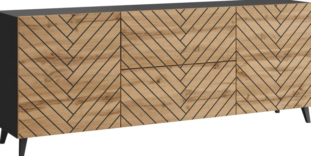 Czarny korpus dodaje meblowi wyrazistości, a ciepłe fronty w kolorze dąb wotan przełamują surowość, tworząc harmonijną kompozycję. Frezowana powierzchnia w jodełkowy wzór podkreśla designerski charakter szafki, czyniąc ją wyjątkowym elementem wnętrza.
