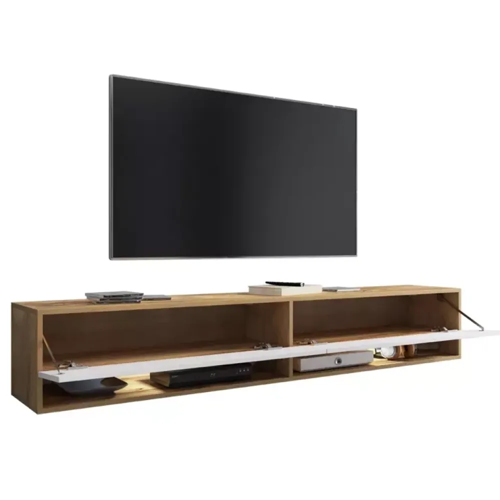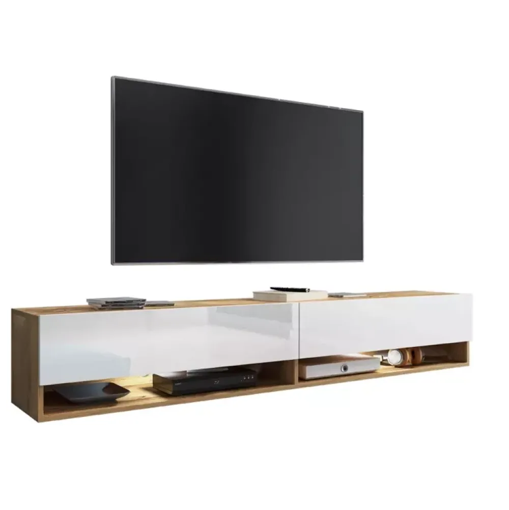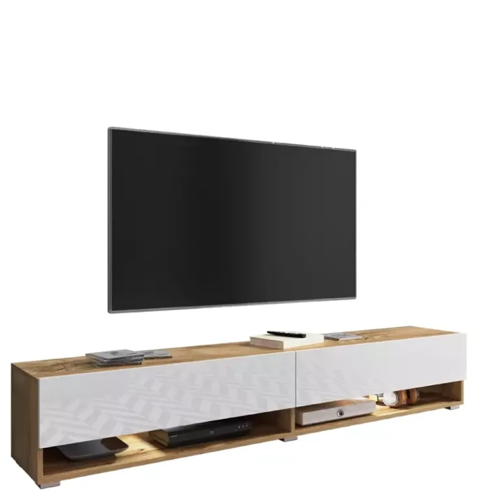 - Duża szafka rtv ma 180 cm szerokości i jej korpus wykonano z płyty w dekorze dąb wotan, a fronty z białej płyty w połysku.