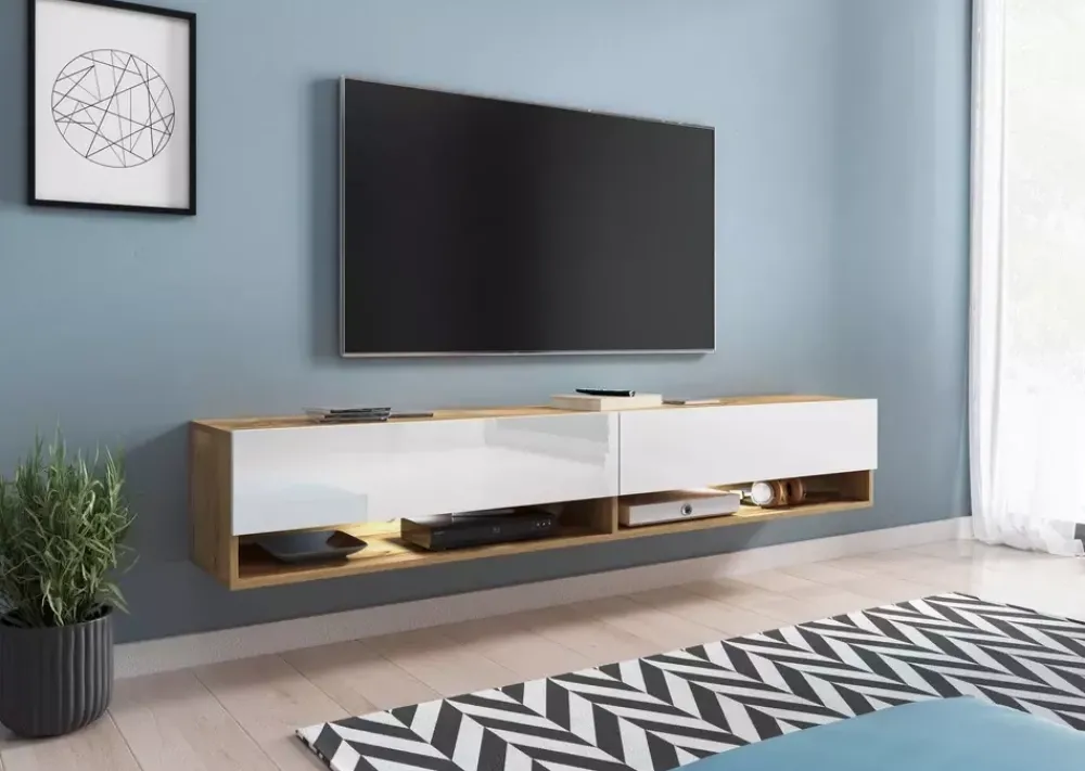 Stolik rtv ma 180 cm szerokości i jest uniwersalny. To znaczy, że w zależności od potrzeb możesz tę szafkę zawiesić lub postawić na dołączonych przez nas stopkach. Uroczy dekor dębu wotan wprowadzi odrobinę przytulnego klimatu do urządzanego wnętrza, a fronty w białym połysku optycznie powiększą przestrzeń.