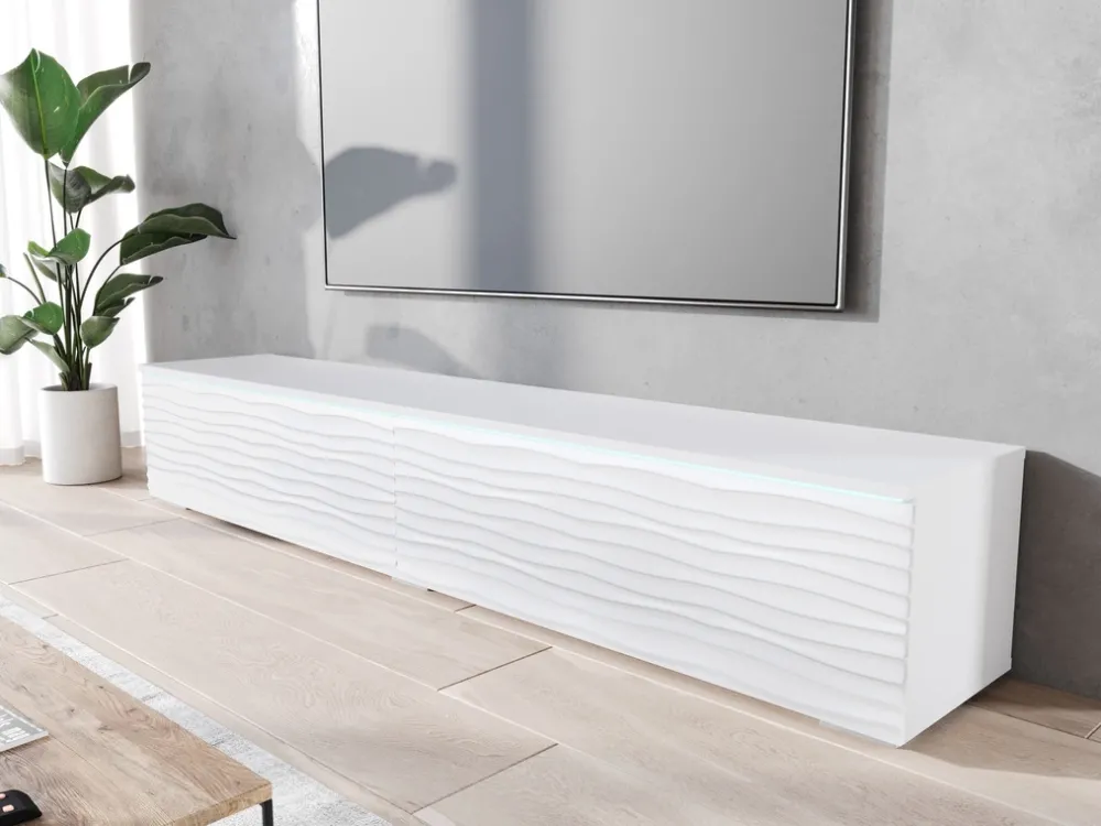 - Szafka RTV BROMI ze wzorem fali na frontach na pewno świetnie wpasuje się do Twojego salonu i podniesie charakter całej aranżacji. Szafka RTV o szerokości 180 cm. Fronty wykonane zostały z solidnej płyty MDF. Szafkę można podświetlić oświetleniem LED.