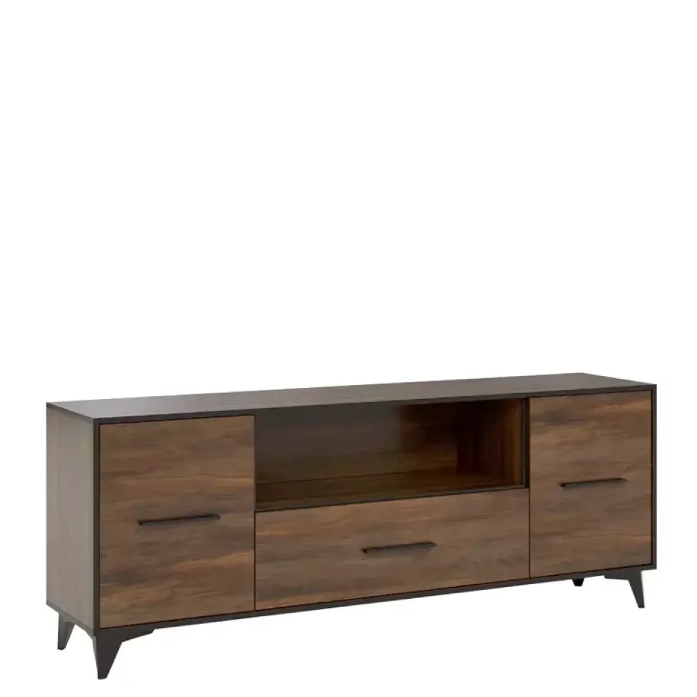 - Szafka RTV FERANO to propozycja, która doskonale sprawdzi się jako miejsce pod telewizor. Posiada drzwi po lewej oraz prawej stronie, natomiast w centralnej części znajduje się szuflada, a nad nią wnęka.
