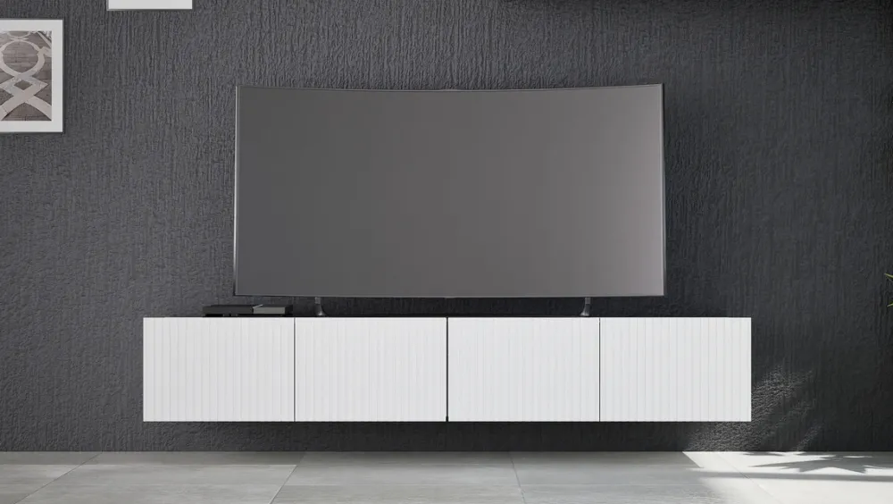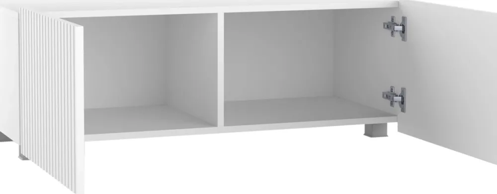 Nowoczesna szafka RTV KORDIS to uniwersalny mebel, który doskonale wpasuje się zarówno w nowoczesne, jak i minimalistyczne wnętrza. Jej elegancka forma i ryflowane fronty nadają wnętrzu wyjątkowego charakteru. Korpus wykonany z płyty laminowanej o grubości 16 mm zapewnia solidność i trwałość, a płyta MDF o tej samej grubości, użyta na frontach, dzięki ryflowaniu nadaje szafce elegancki wygląd i unikalną fakturę.