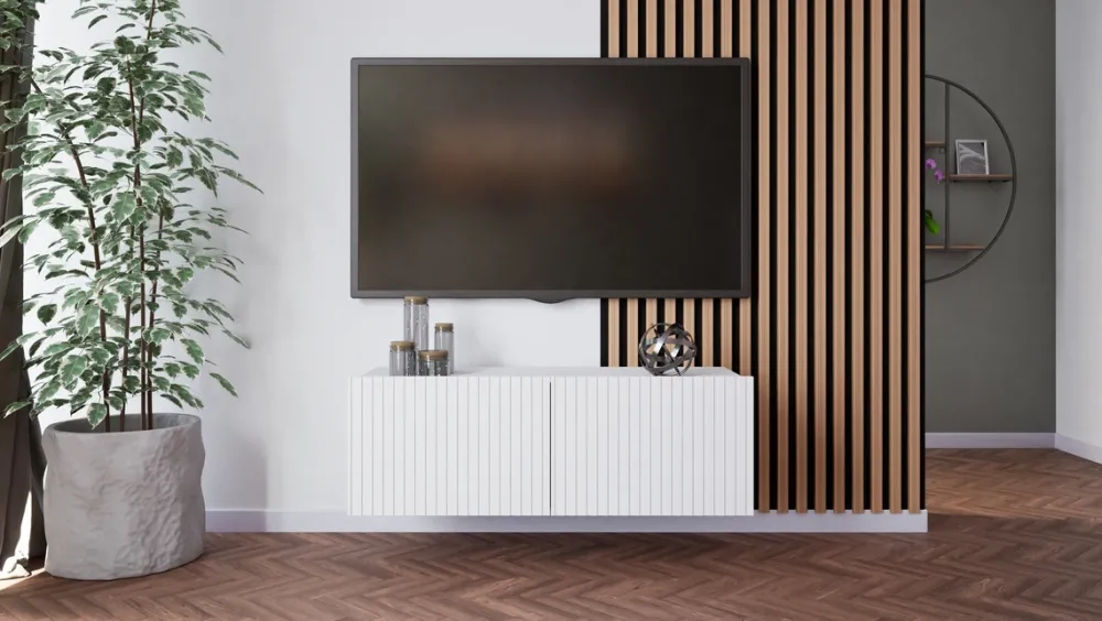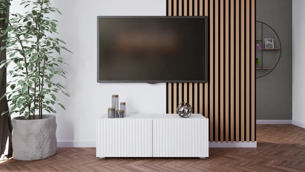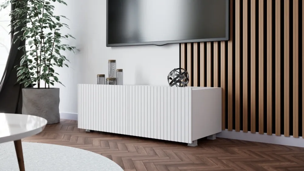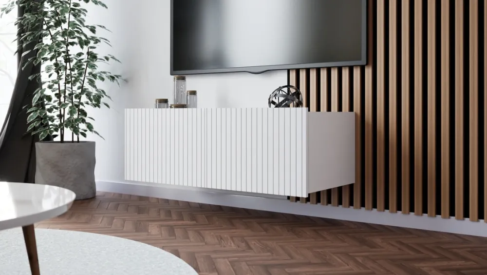 - Nowoczesna szafka RTV 100 cm KORDIS wyróżnia się ryflowanymi frontami wykonanymi z solidnej płyty MDF o grubości 16 mm. Fronty szafki wyposażone zostały w cichy domyk. Szafkę RTV można zawiesić na ścianie lub postawić na nóżkach.