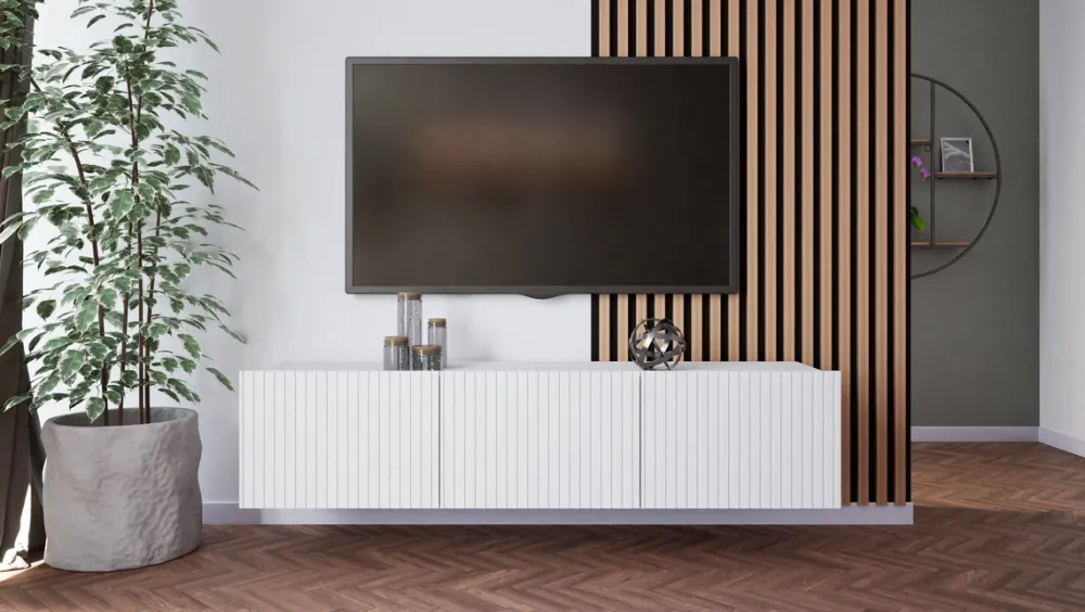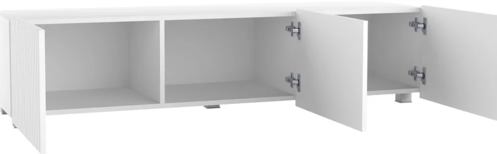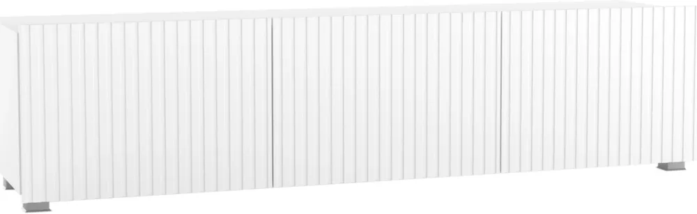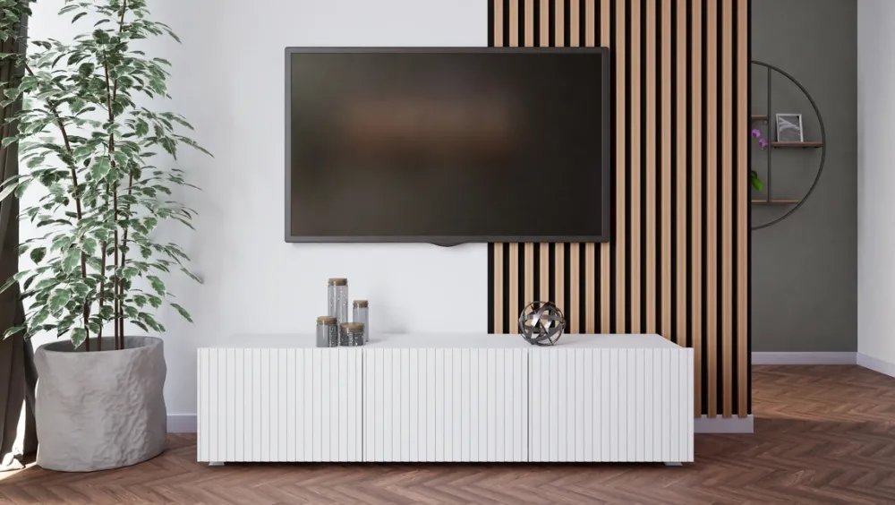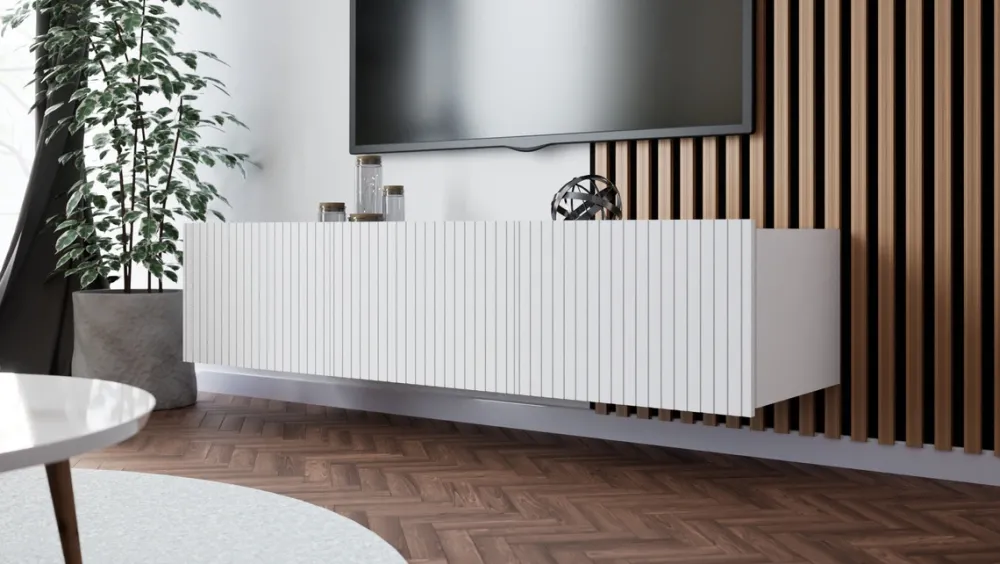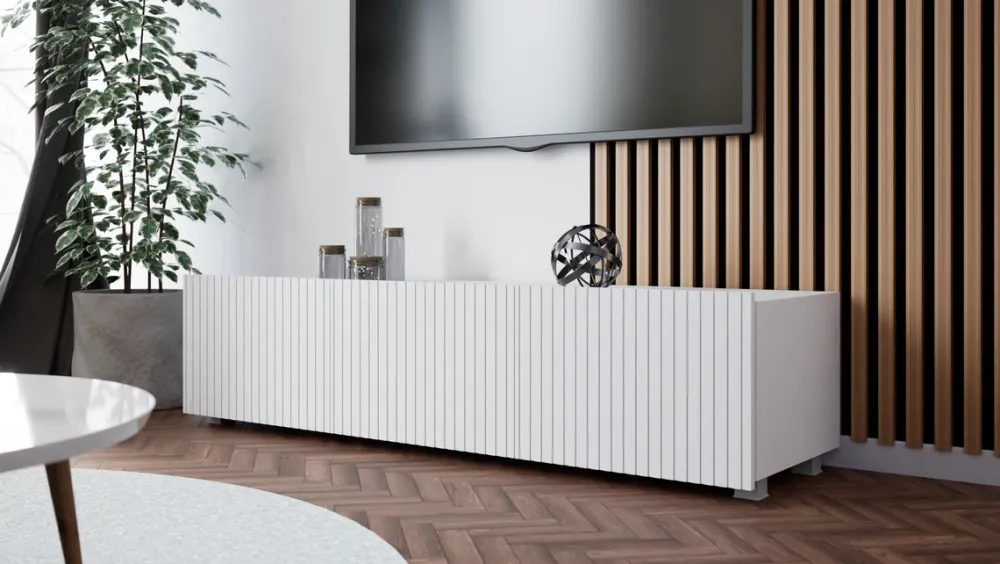 - Nowoczesna szafka RTV 150 cm KORDIS wyróżnia się ryflowanymi frontami wykonanymi z solidnej płyty MDF o grubości 16 mm. Fronty szafki wyposażone zostały w cichy domyk. Szafkę RTV można zawiesić na ścianie lub postawić na nóżkach.