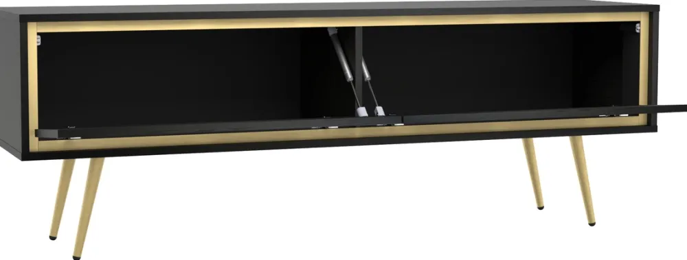 - Wysokie, smukłe metalowe nóżki nadają szafce RTV lekkości i ułatwiają utrzymanie porządku pod meblem, a ich złoty kolor idealnie komponuje się ze stylem glamour, dodając wnętrzu nutę elegancji.