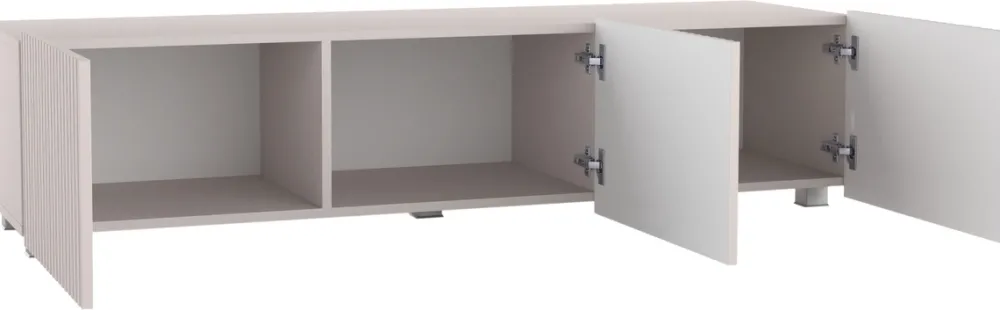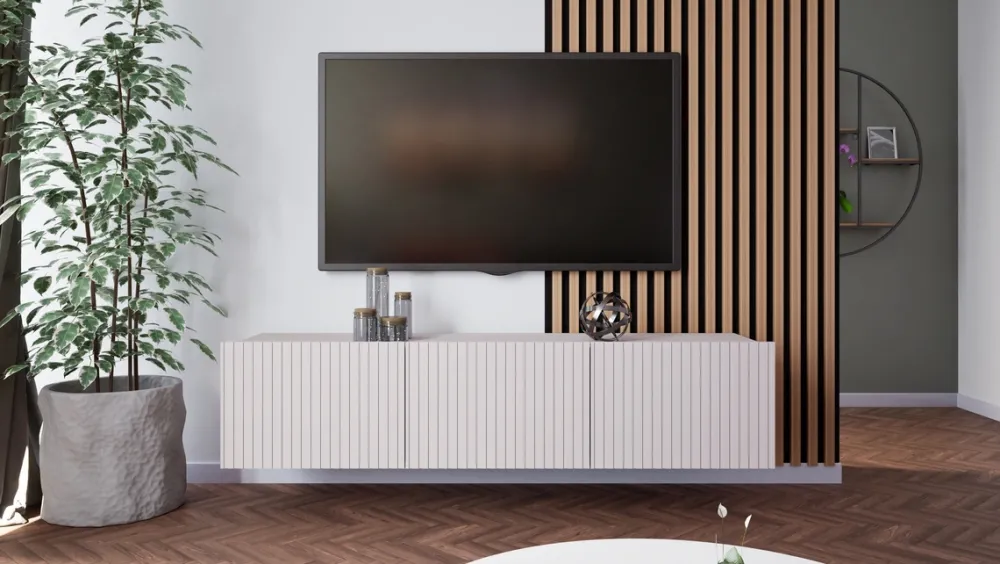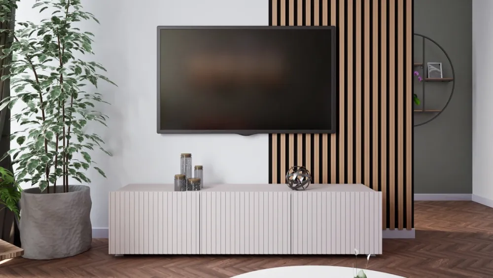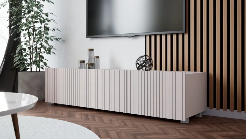 - Nowoczesna szafka RTV 150 cm KORDIS wyróżnia się ryflowanymi frontami wykonanymi z solidnej płyty MDF o grubości 16 mm. Fronty szafki wyposażone zostały w cichy domyk. Szafkę RTV można zawiesić na ścianie lub postawić na nóżkach.