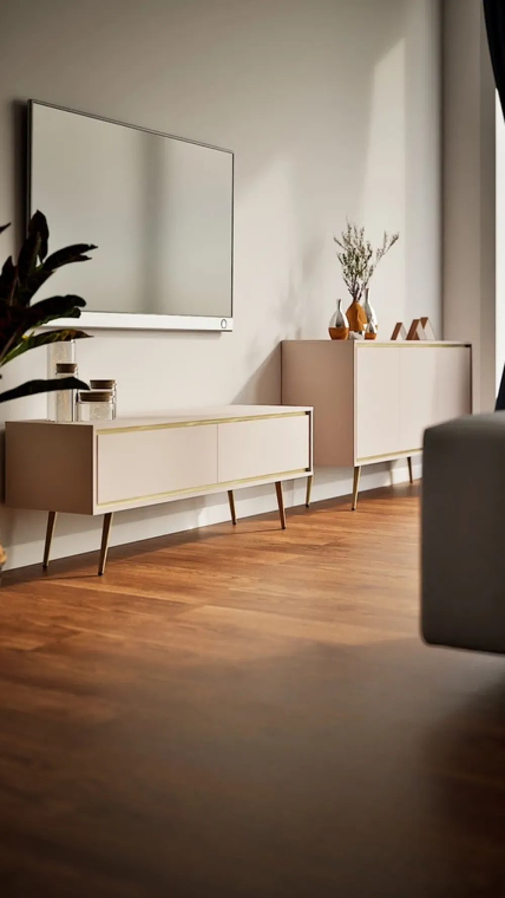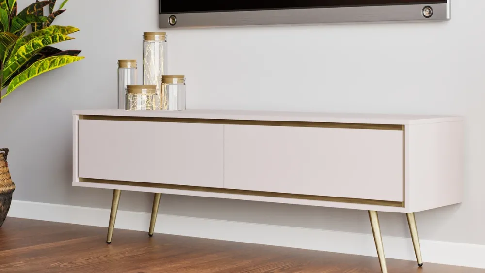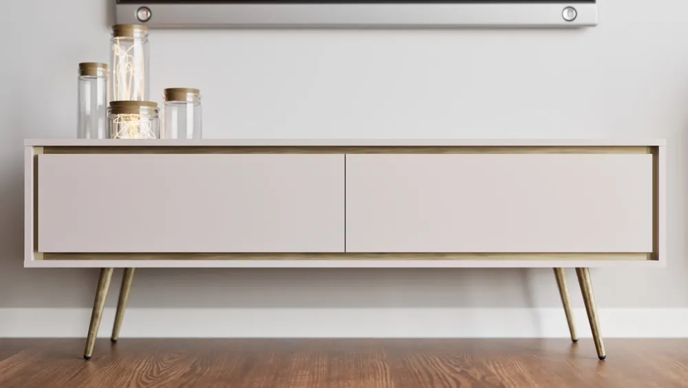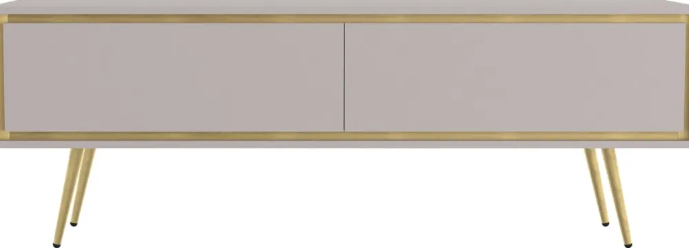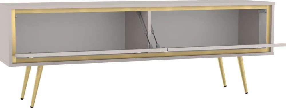 - Wysokie, smukłe metalowe nóżki nadają szafce RTV lekkości i ułatwiają utrzymanie porządku pod meblem, a ich złoty kolor idealnie komponuje się ze stylem glamour, dodając wnętrzu nutę elegancji.