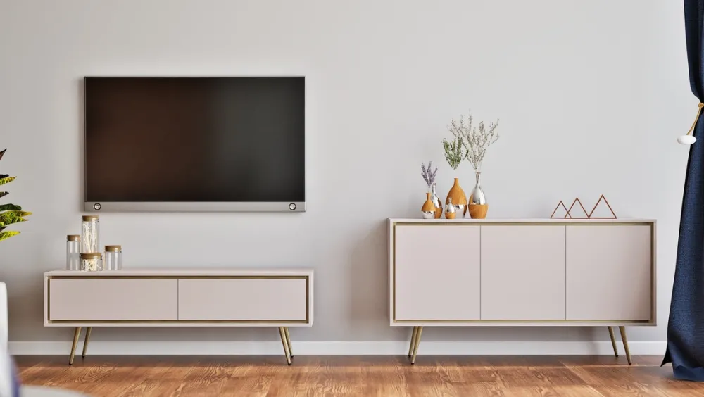 Wykonana z wysokiej jakości płyty laminowanej, szafka RTV na nóżkach TALUS jest trwała i odporna na codzienne użytkowanie. Dwoje uchylnych drzwi z systemem push to open oferują sporo miejsca, w którym można przechowywać sprzęt audio-wideo, dekodery, kolekcje filmów czy konsolę do gier, dbając o porządek i estetykę przestrzeni.