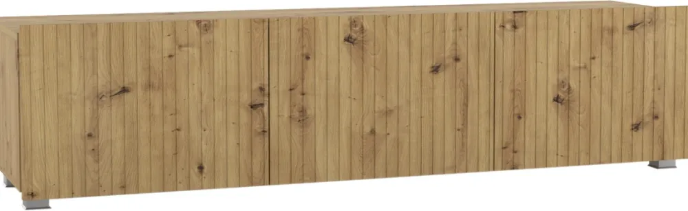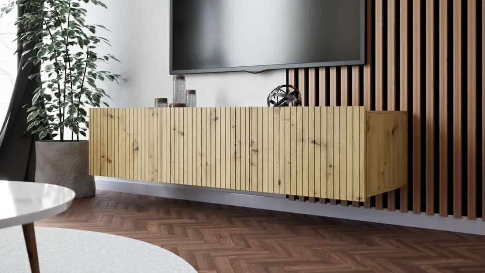 - Nowoczesna szafka RTV 150 cm KORDIS wyróżnia się ryflowanymi frontami wykonanymi z solidnej płyty MDF o grubości 16 mm. Fronty szafki wyposażone zostały w cichy domyk. Szafkę RTV można zawiesić na ścianie lub postawić na nóżkach.