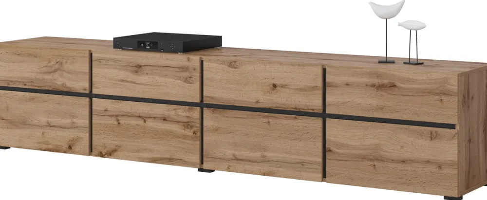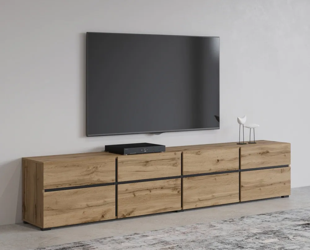 Dzięki swojemu nowoczesnemu designowi szafka RTV 225 cm CROSS doskonale wpisuje się w każde współczesne wnętrze. Niezależnie od tego, czy Twój salon jest urządzony w stylu minimalistycznym, skandynawskim, czy industrialnym, ten mebel będzie jego idealnym uzupełnieniem, dodając przestrzeni stylu i elegancji.