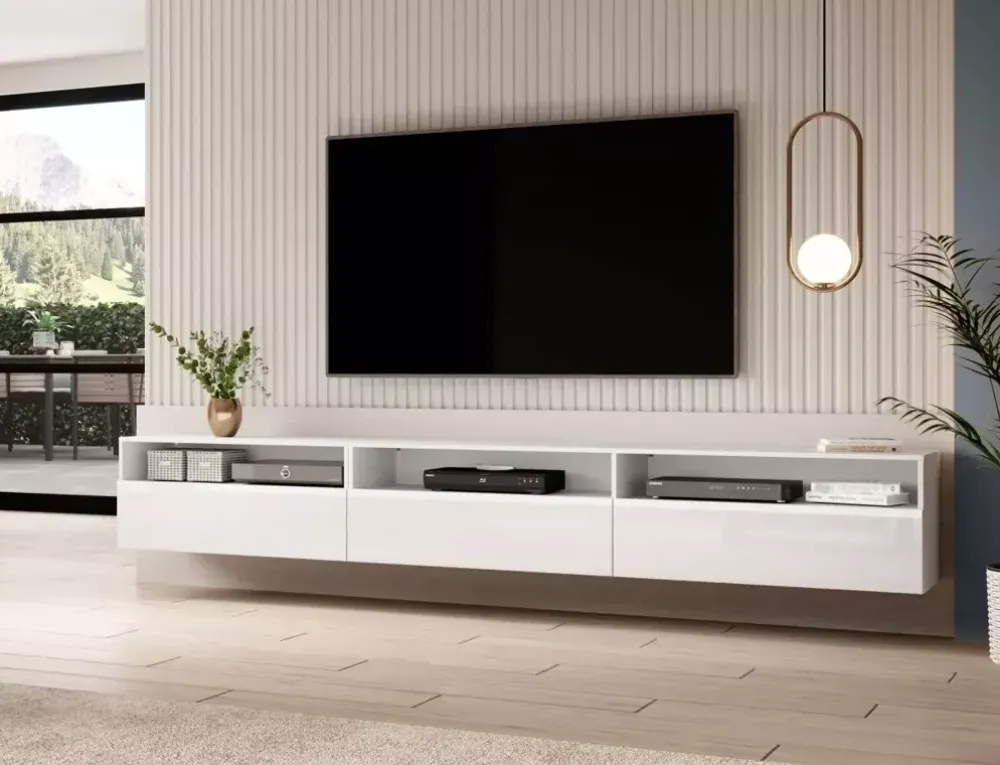 Nowoczesna szafka rtv o szerokości 270 cm z trzema półkami i trzema uchylnymi w dół drzwiczkami