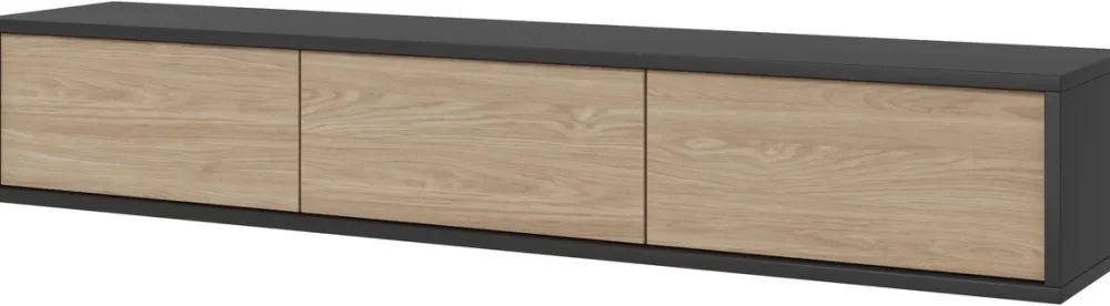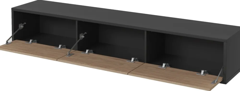 - Nowoczesna szafka RTV do salonu FRIDA w kolorze antracyt z frontami w kolorze dąb olejowany. Szafkę RTV można powiesić na ścianie lub postawić na nóżkach dołączonych w zestawie. Nowoczesna szafka RTV otwiera się dzięki mechanizmowi push to open.