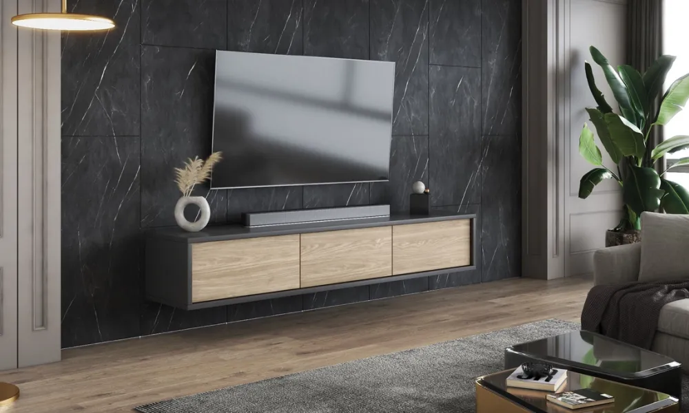 Wisząca szafka RTV jest także bardzo praktyczna dzięki przemyślanej konstrukcji. Posiada troje drzwi, za którymi kryje się dużo miejsca na przechowywanie różnorodnych sprzętów RTV, konsol do gier, filmów, książek czy innych akcesoriów, pomagając utrzymać porządek w salonie. Obrzeża szafki zostały zabezpieczone okleiną ABS, co dodatkowo chroni je przed uszkodzeniami mechanicznymi, zapewniając trwałość i estetyczny wygląd przez długi czas.