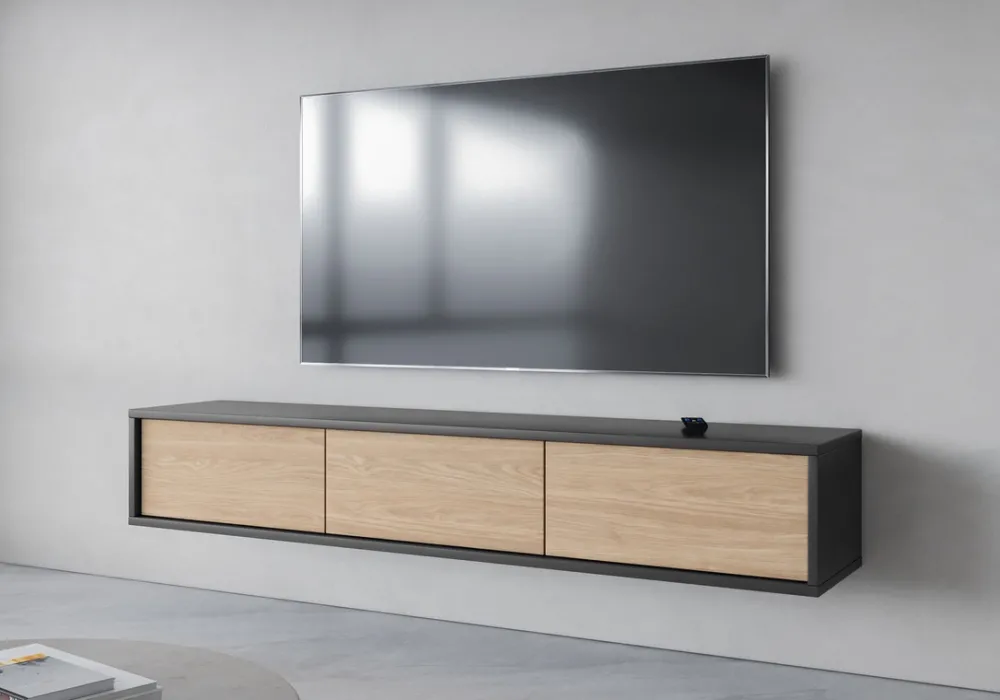 Jednym z głównych atutów podwieszanej szafki RTV FRIDA jest mechanizm otwierania push to open. Dzięki niemu wystarczy jedno lekkie dotknięcie, aby otworzyć szafkę, co zwiększa komfort użytkowania i eliminuje potrzebę stosowania tradycyjnych uchwytów. To rozwiązanie podkreśla nowoczesny charakter mebla, a jednocześnie zachowuje jego minimalistyczny wygląd.