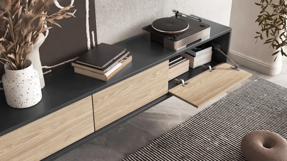 - Szafka RTV otwiera się dzięki mechanizmowi push to open, więc wystarczy jedno dotknięcie, żeby otworzyć mebel.
