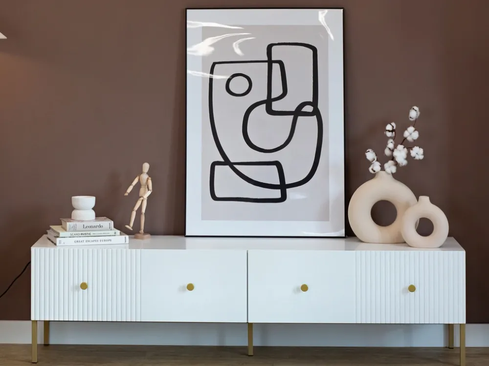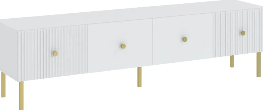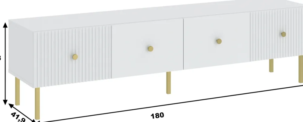 Szafka RTV 180 cm do salonu VALTEO to połączenie minimalistycznego designu z luksusowym wykończeniem. Biała bryła ozdobiona dekoracyjnymi lamelami i złotymi akcentami idealnie wpisuje się w aranżacje glamour, nowoczesne i klasyczne. Dzięki przemyślanej konstrukcji zyskujesz nie tylko estetyczne, ale i bardzo praktyczne rozwiązanie do przechowywania sprzętu RTV oraz dodatków.