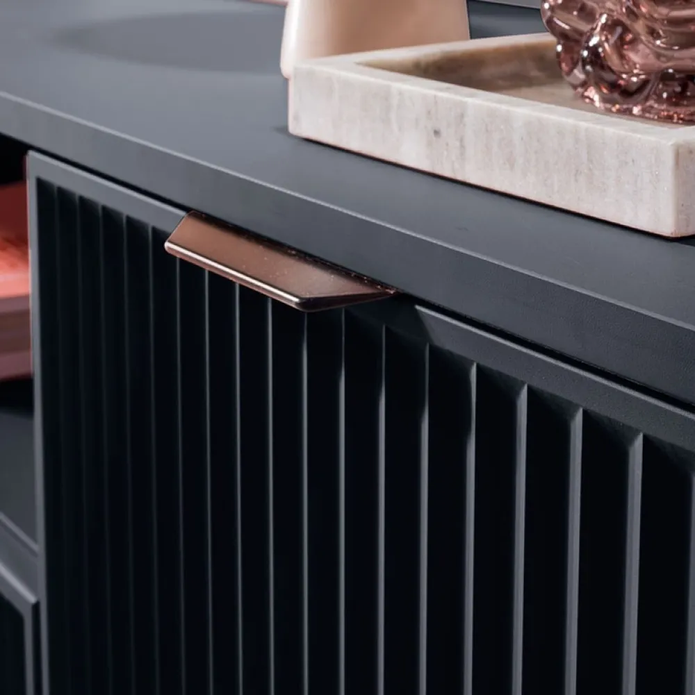 Szafka ma solidne obrzeże ABS, zapewniające jej trwałość i odporność na codzienne użytkowanie. Miedziane, metalowe uchwyty dodają elementu luksusu, a czarne, metalowe nogi zapewniają stabilność i doskonale kontrastują z kolorystyką korpusu.