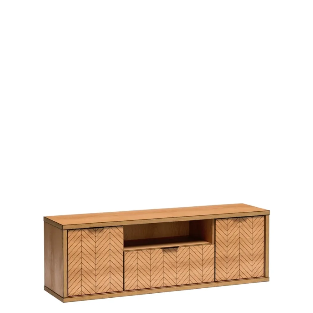 Wzór na frontach w postaci czarnej jodełki nadaje szafce RTV unikalny charakter. Ten subtelny, ale wyrazisty detal dodaje meblowi głębi i ciepła, wprowadzając do Twojego salonu niepowtarzalny styl.