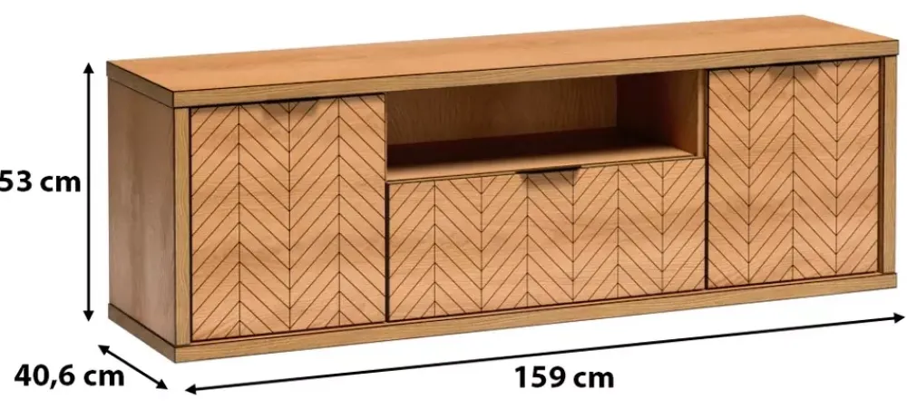 - Zapraszamy do odkrycia naszej szafki RTV FONETTI o szerokości 159 cm. Wykonana w kolorze dębu karmel, z frezowanym wzorem czarnej jodełki na frontach, jest idealnym dodatkiem do Twojego salonu. Styl i funkcjonalność spotykają się w jednym meblu.