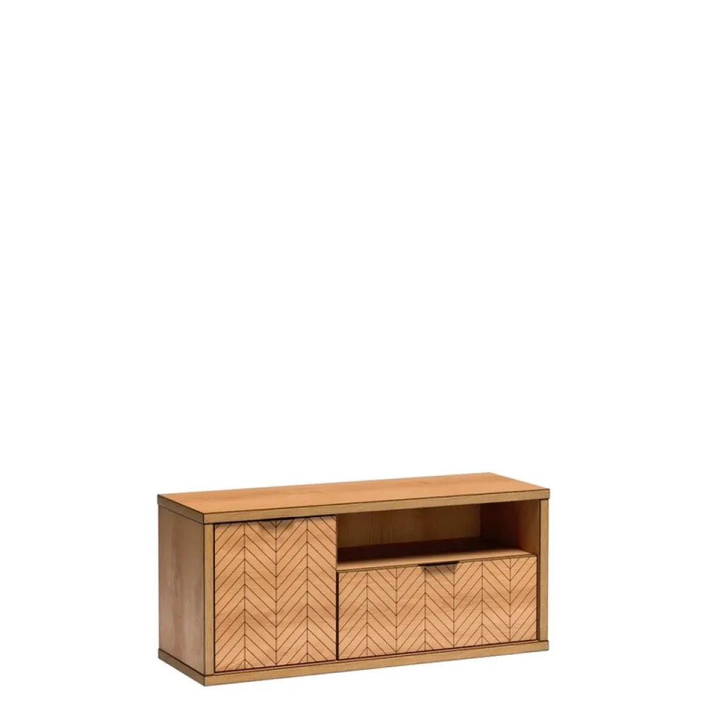 Na prawej stronie szafki znajduje się praktyczna szuflada, która zapewnia niezwykle pojemne miejsce do przechowywania wszystkiego, od pilotów po gry i inne akcesoria multimedialne. Bezpośrednio nad szufladą znajduje się otwarta półka – doskonałe miejsce na dekoder, odtwarzacz DVD lub konsolę do gier.