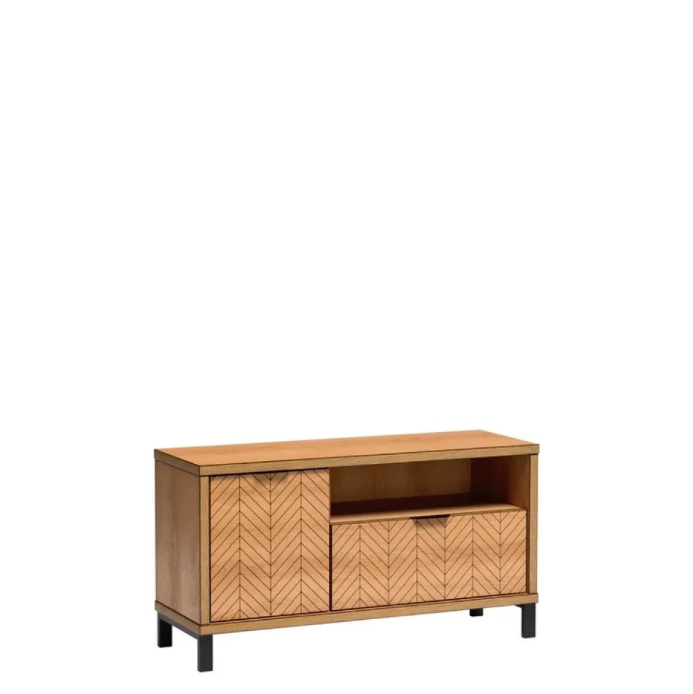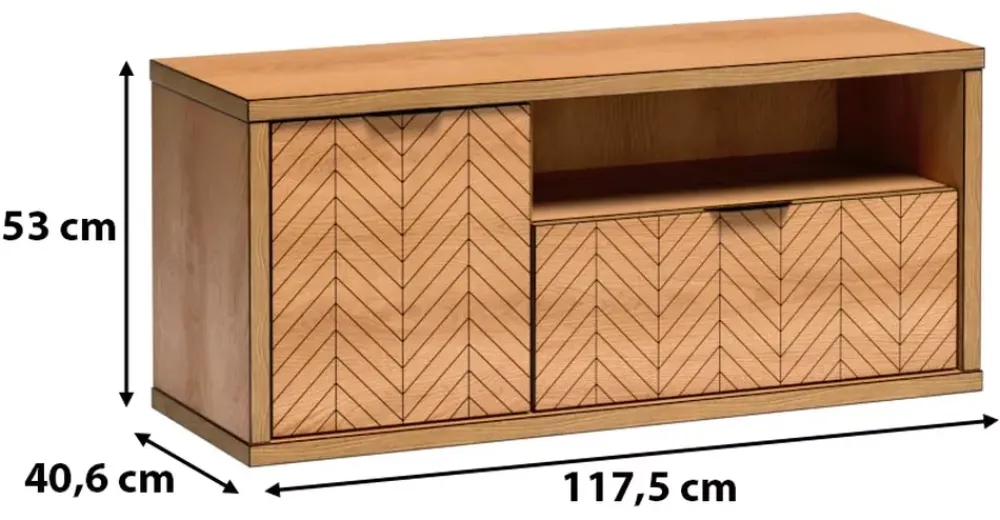 - Ożyw swój salon z naszą szafką RTV FONETTI w kolorze dębu karmel. Frezowany wzór czarnej jodełki na frontach dodaje charakteru. Praktyczna konstrukcja z szufladą, otwartą półką i drzwiami łączy styl i funkcjonalność w jednym meblu.