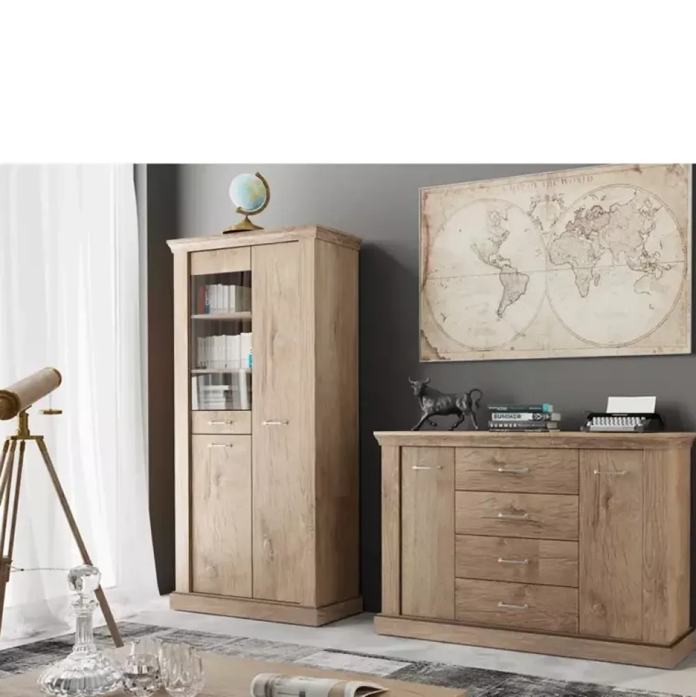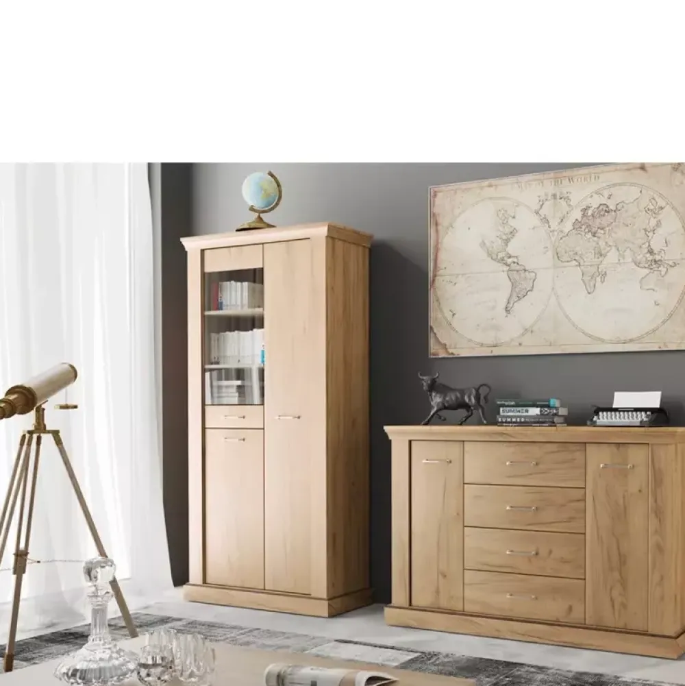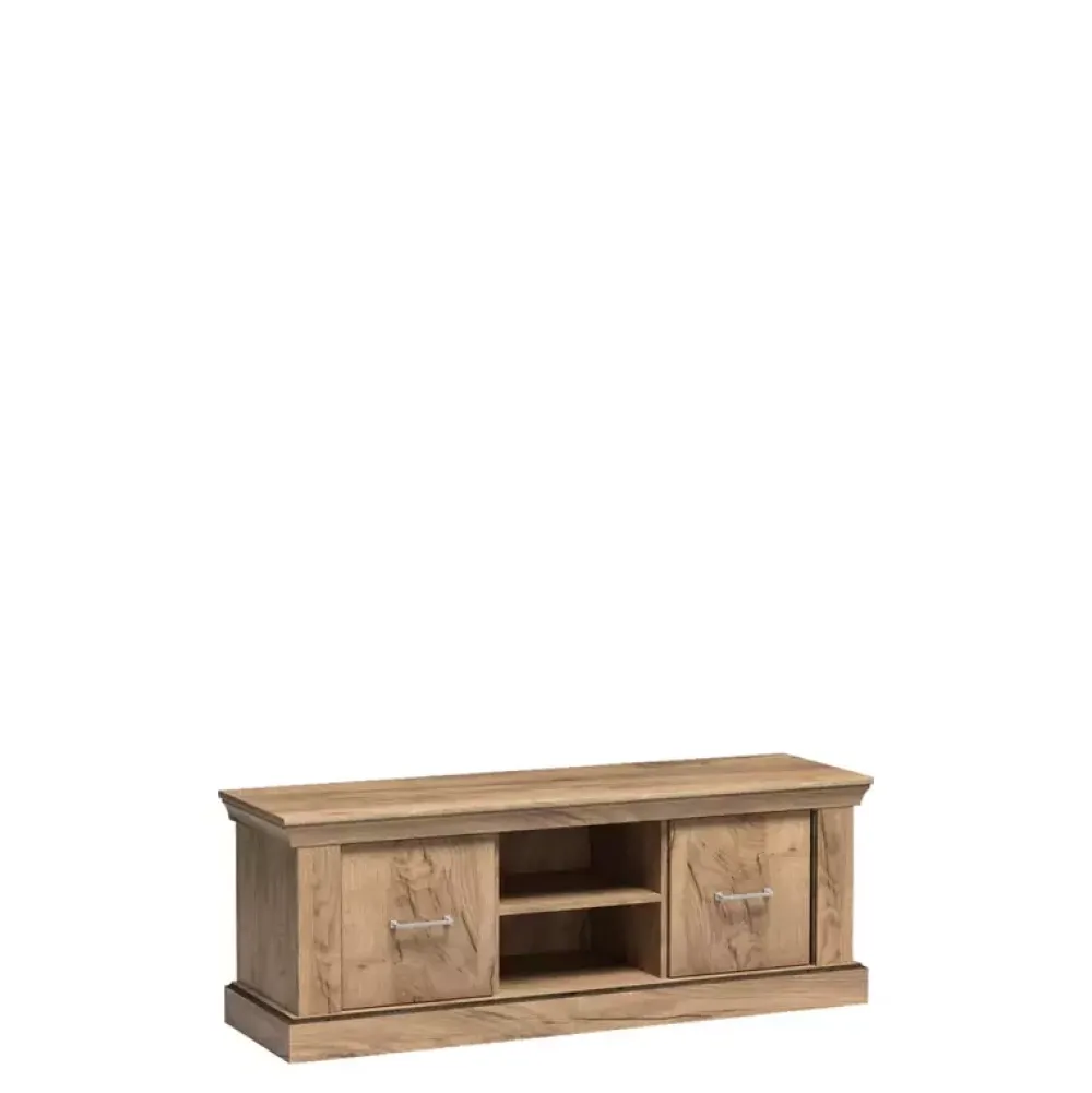 Szafa RTV ADRE została wykonana w klasycznym stylu, który czyni z niej bardzo elegancką propozycją. Posiada dwie szafki po bokach, w każdej z nich znajduje się półka, na której możesz umieścić swoje akcesoria, które zyskają odrobinę prywatności. Dodatkowo otwarta półka w centralnej części szafki jest świetnym miejscem na umieszczenie dekorów lub pamiątek, dzięki którym nadasz pomieszczeniu swoich własnych oraz niepowtarzalnych akcentów.