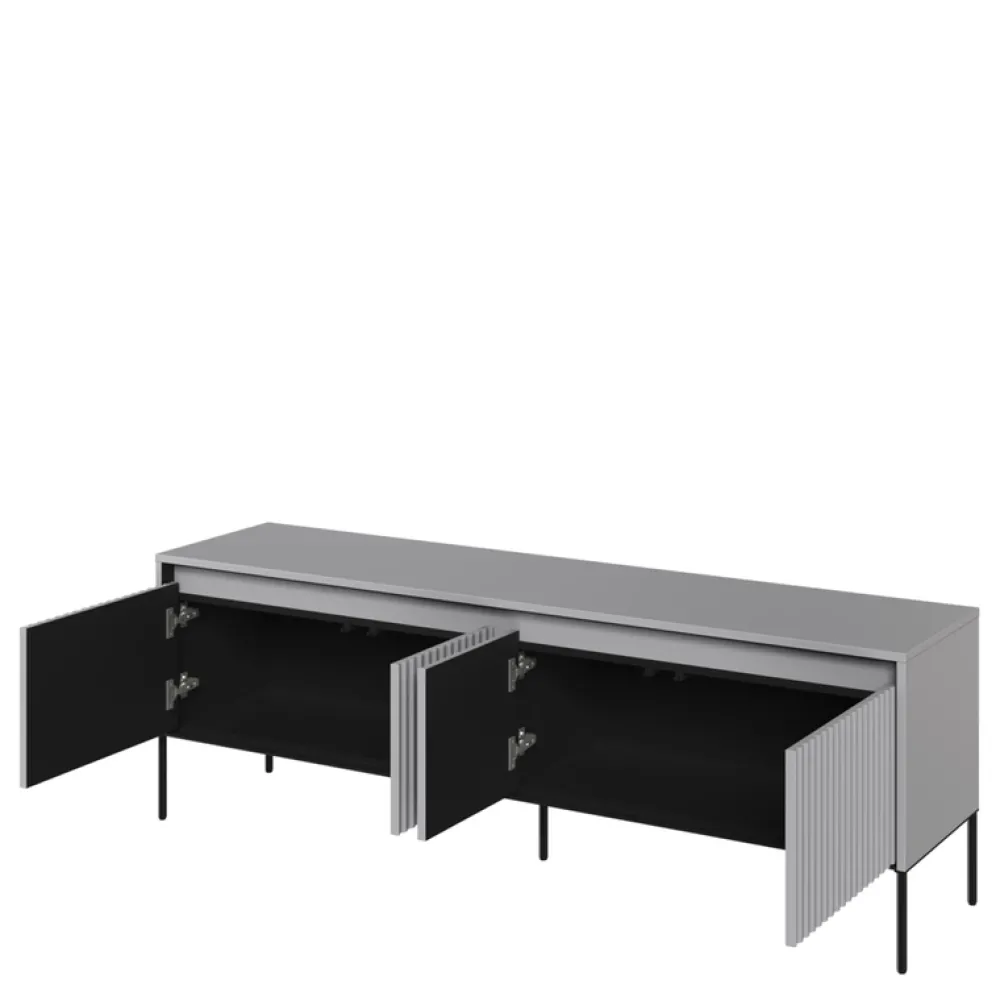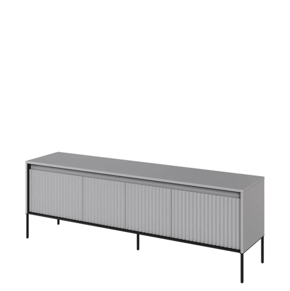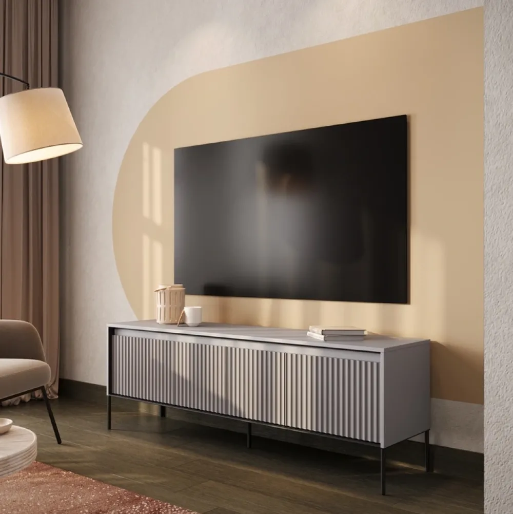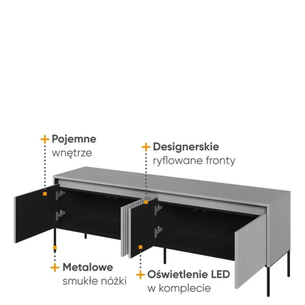 Nowoczesna szafka RTV stoi na wysokich, metalowych nóżkach, które dodają jej eleganckiego charakteru, jednocześnie ułatwiając utrzymanie czystości pod meblem i umożliwiając wjazd odkurzaczom samojezdnym.