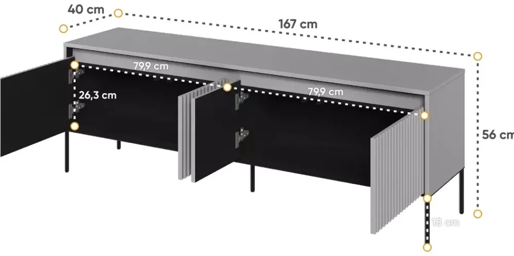 Otwórz przestrzeń swojego salonu dzięki naszej szafce RTV TREND, której design łączy w sobie elegancję z funkcjonalnością. O szerokości 167 cm jest idealna dla tych, którzy cenią sobie przestronność i porządek.