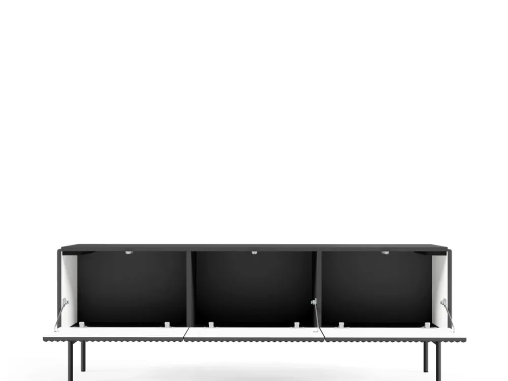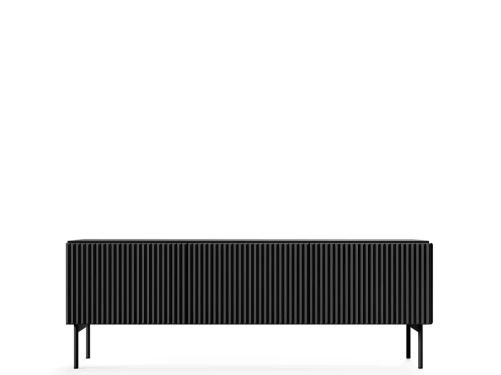 - Szafka RTV wykonana z laminowanej płyty i ryflowanej MDF w kolorze czarnym. Posiada trzy komory, system push to open, metalowe nogi 18 cm, obrzeża ABS. Bezuchwytowy front podkreśla nowoczesny styl i funkcjonalność. Idealna pod telewizor do 60 cali.