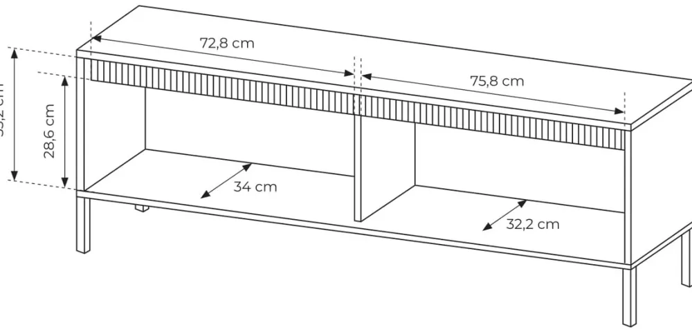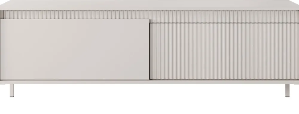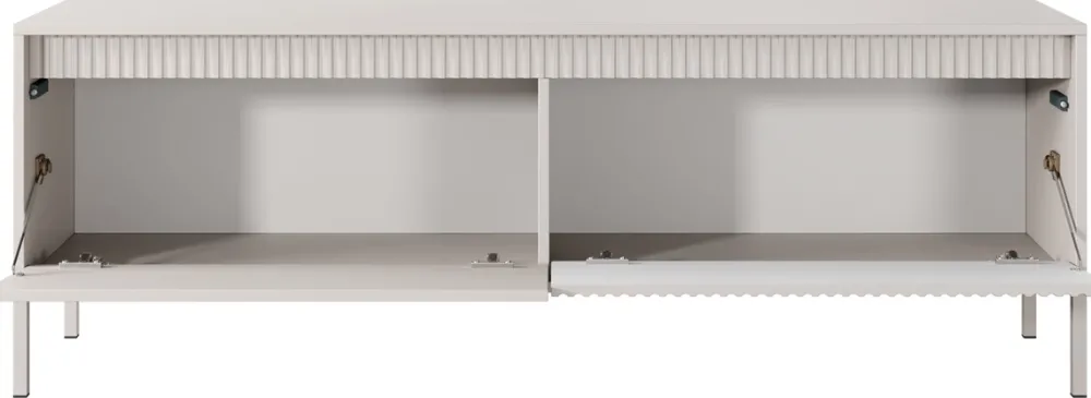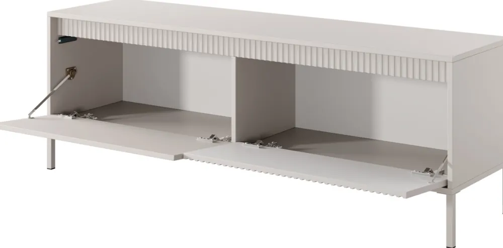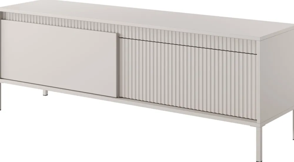 - Szafka RTV 153 cm SAREVO z frezowanymi frontami i wysokimi metalowymi nóżkami to elegancki i funkcjonalny wybór do salonu. Dwoje drzwi z półkami zapewnia porządek i estetykę w strefie multimedialnej.